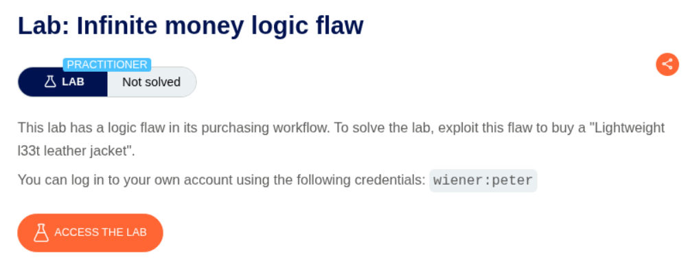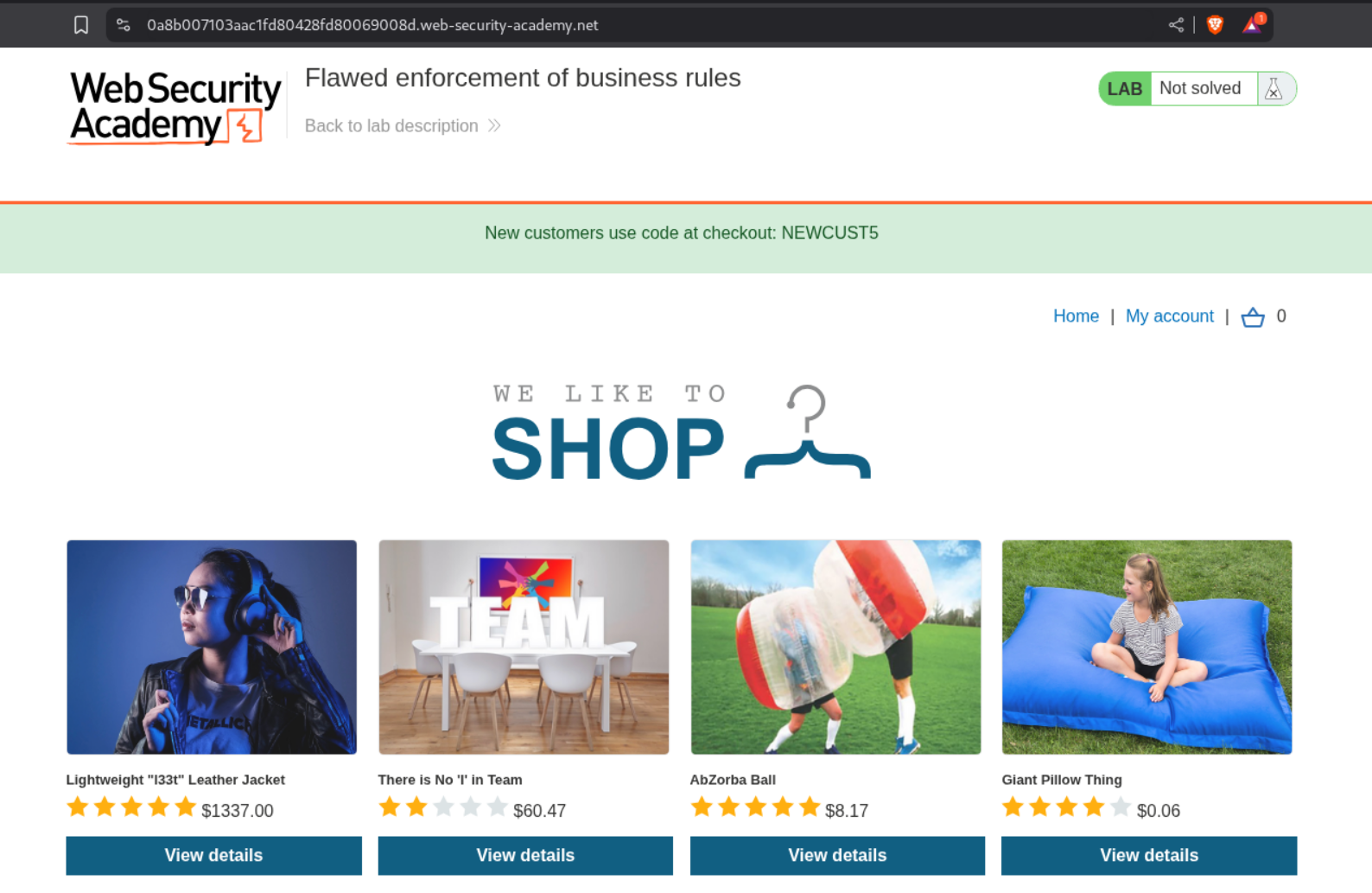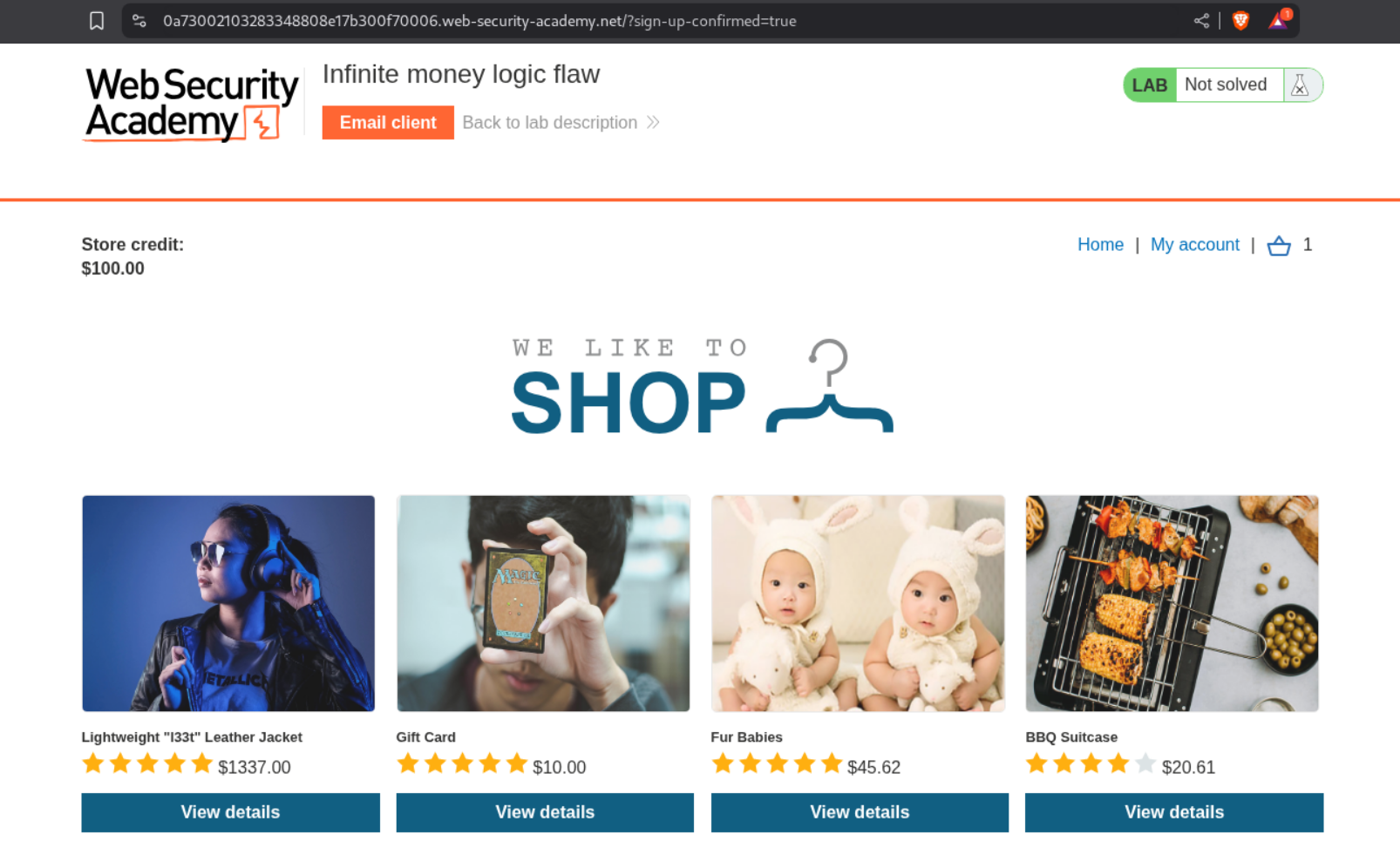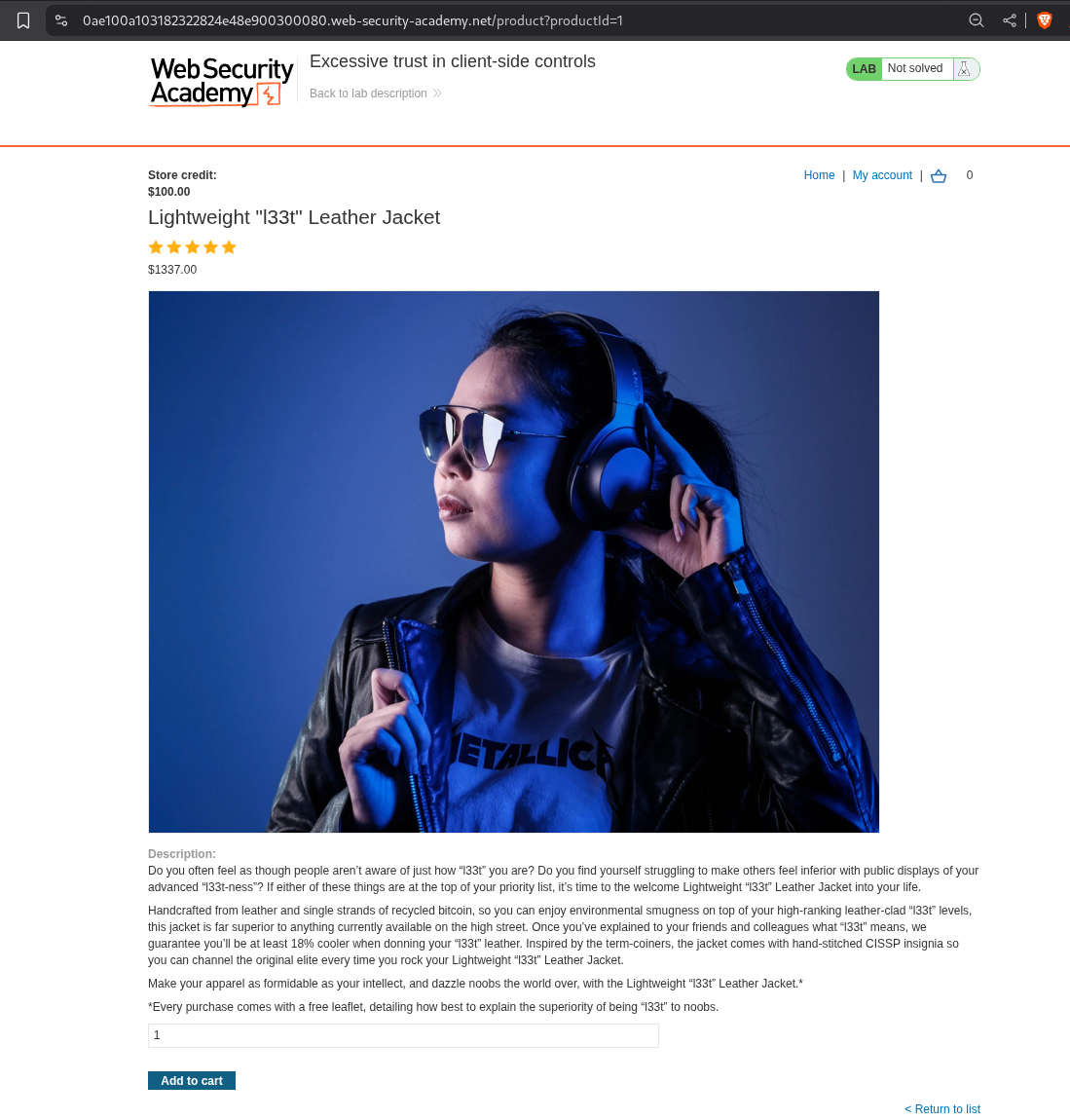 This lab is also a favorite one of mine. There is a bug here to get infinite money. We are supposed to buy the Lightweight l33t leather jacket.