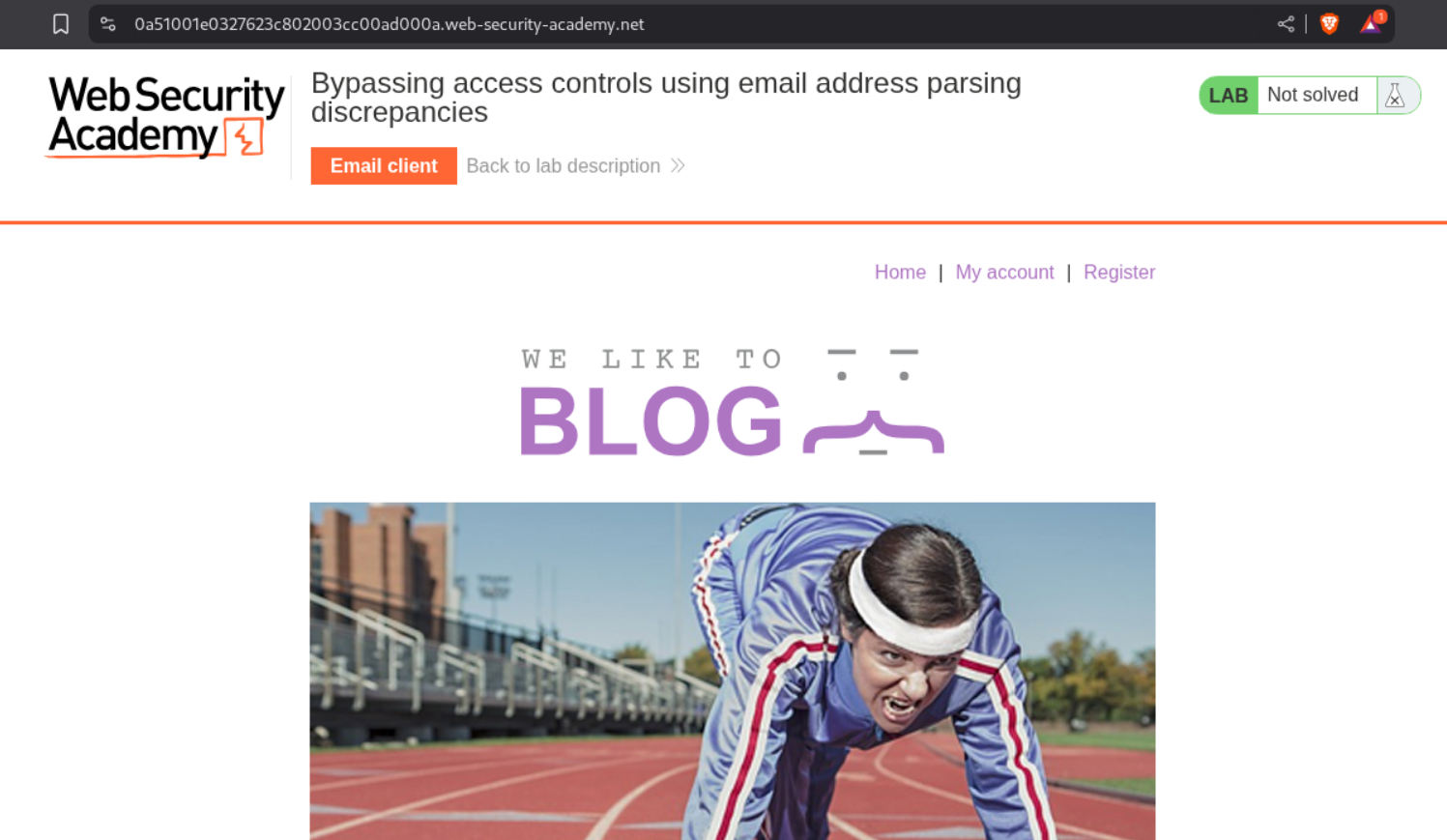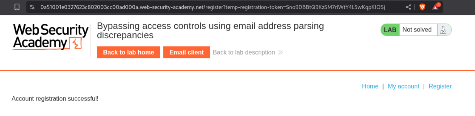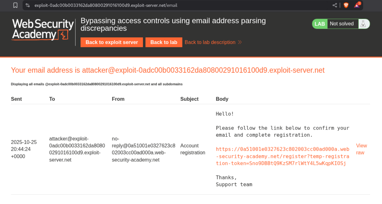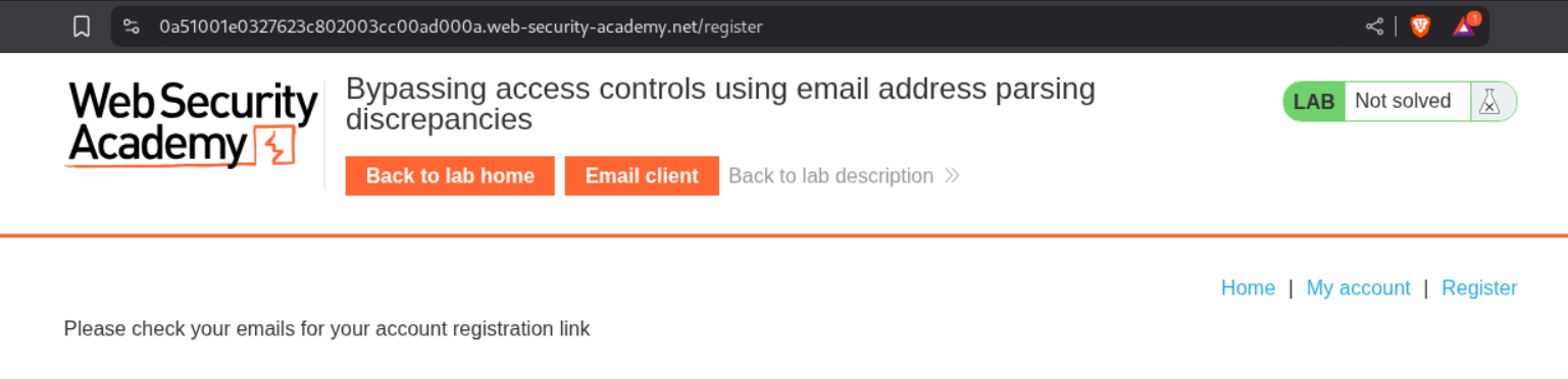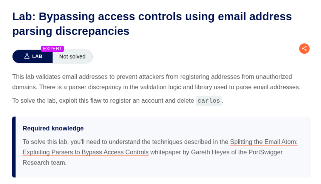 Read this paper - https://portswigger.net/research/splitting-the-email-atom to understand how to solve this lab.