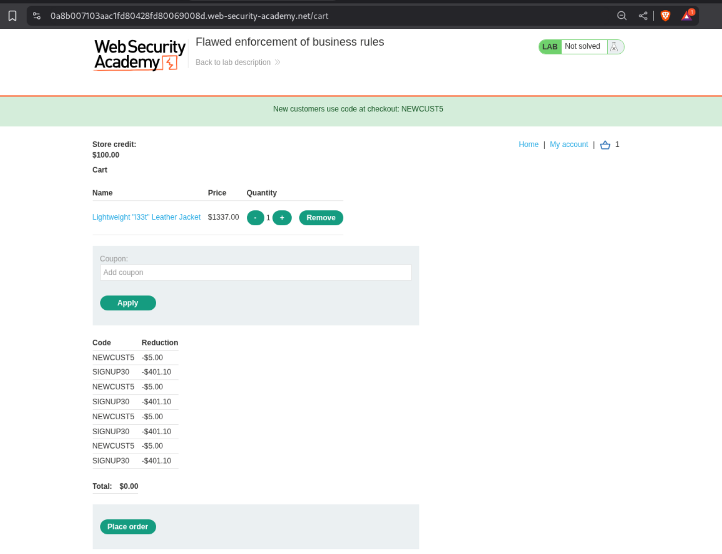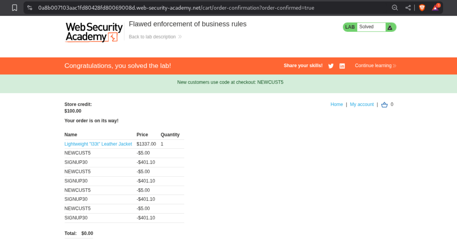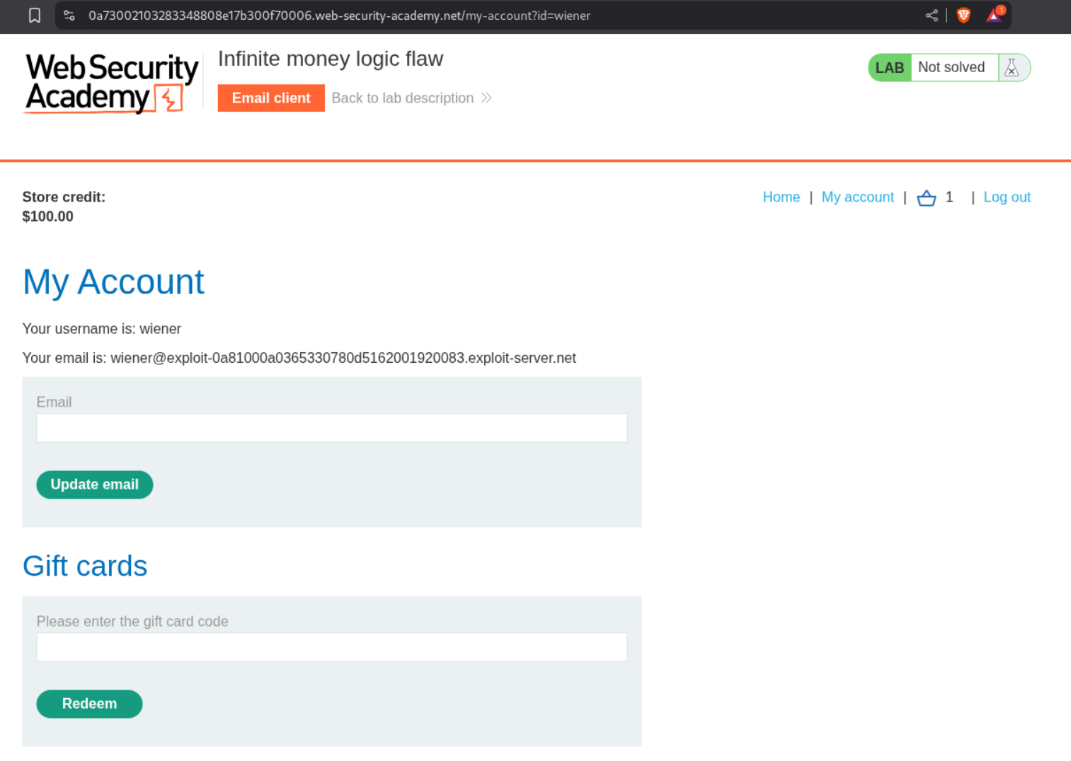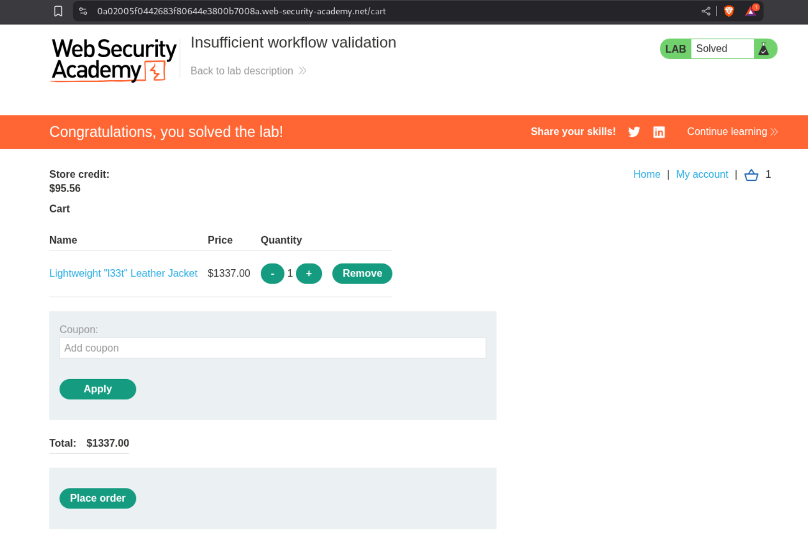 What made these labs particularly interesting was how they required understanding the application’s purpose, not just its technical implementation. The infinite money lab with gift card automation was especially clever—turning a simple coupon bug into unlimited credit through Burp macros.