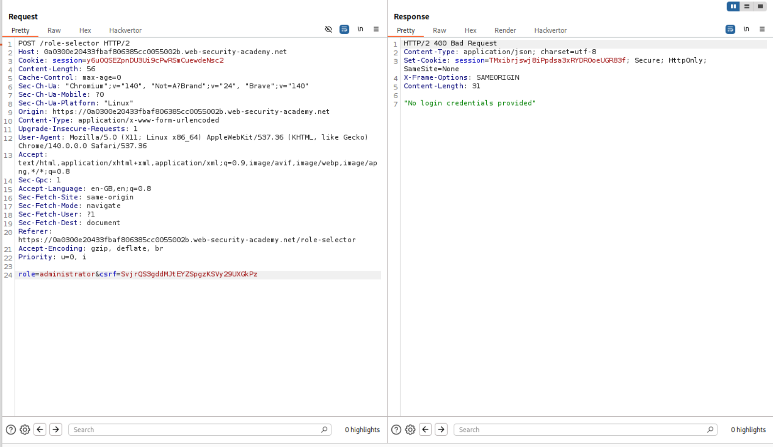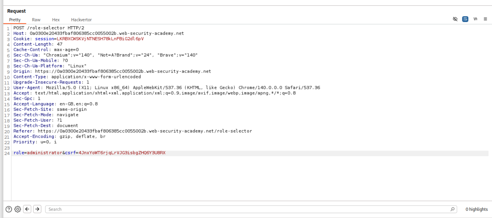 I tried to change the role to administrator in the request via burp, but that does not work. Maybe this needs to be done via intercept.