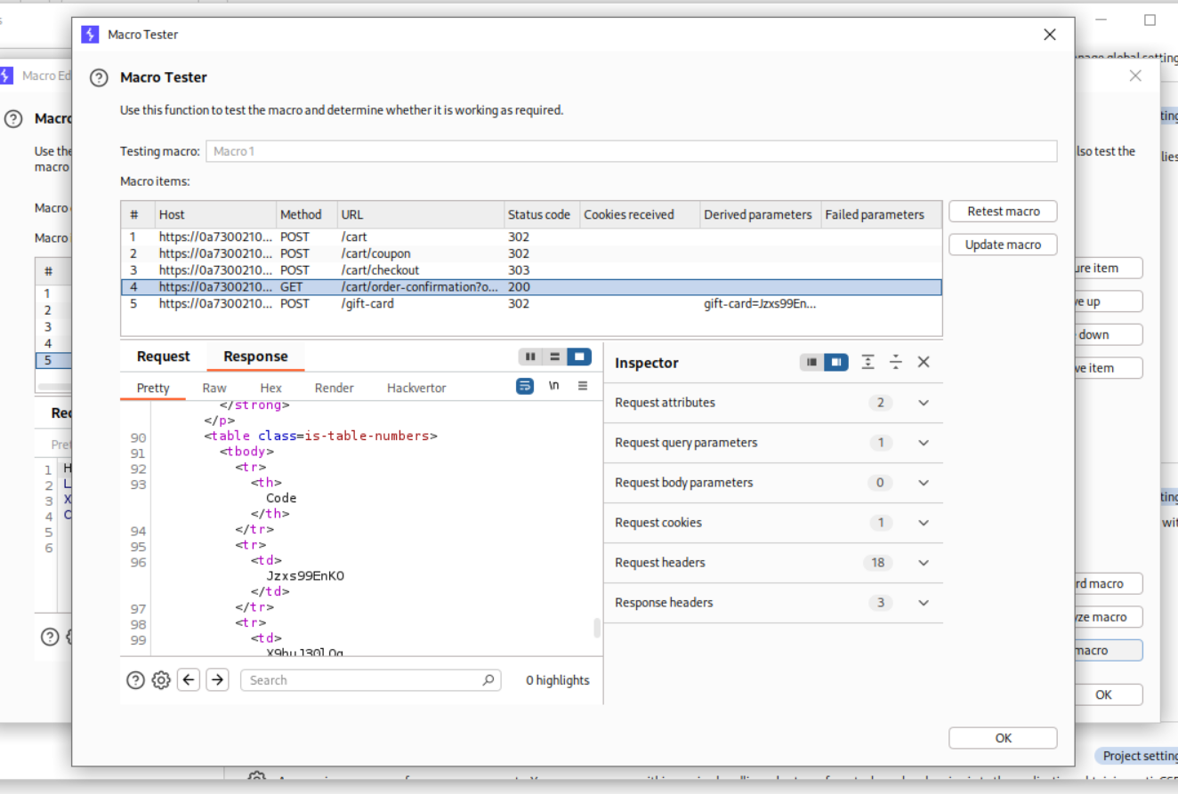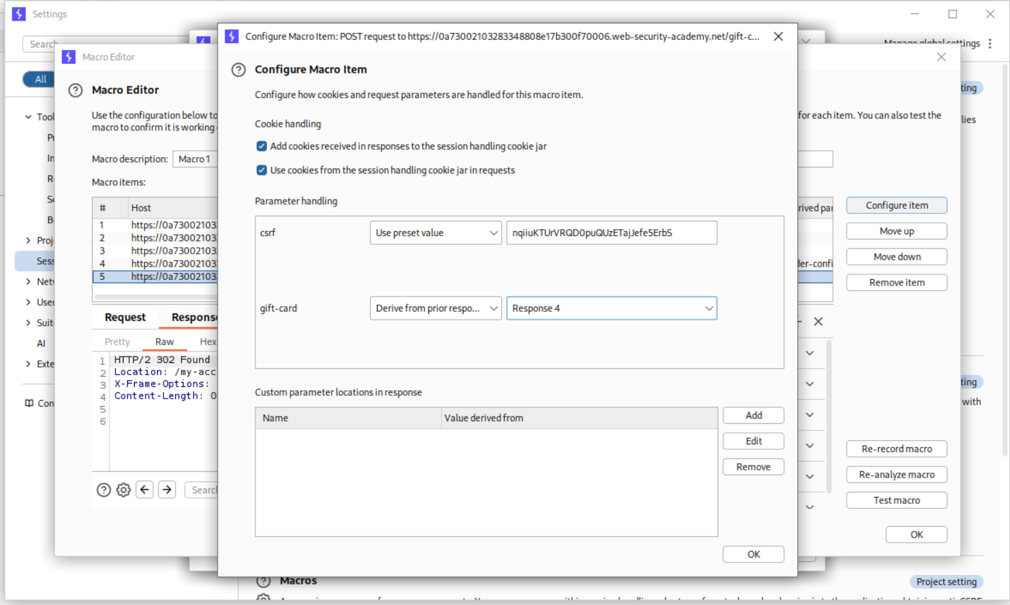 Now we click on the 5th request and configure the macro item. We add the custom parameter gift-card and we derive it from previous response, i.e. response 4.