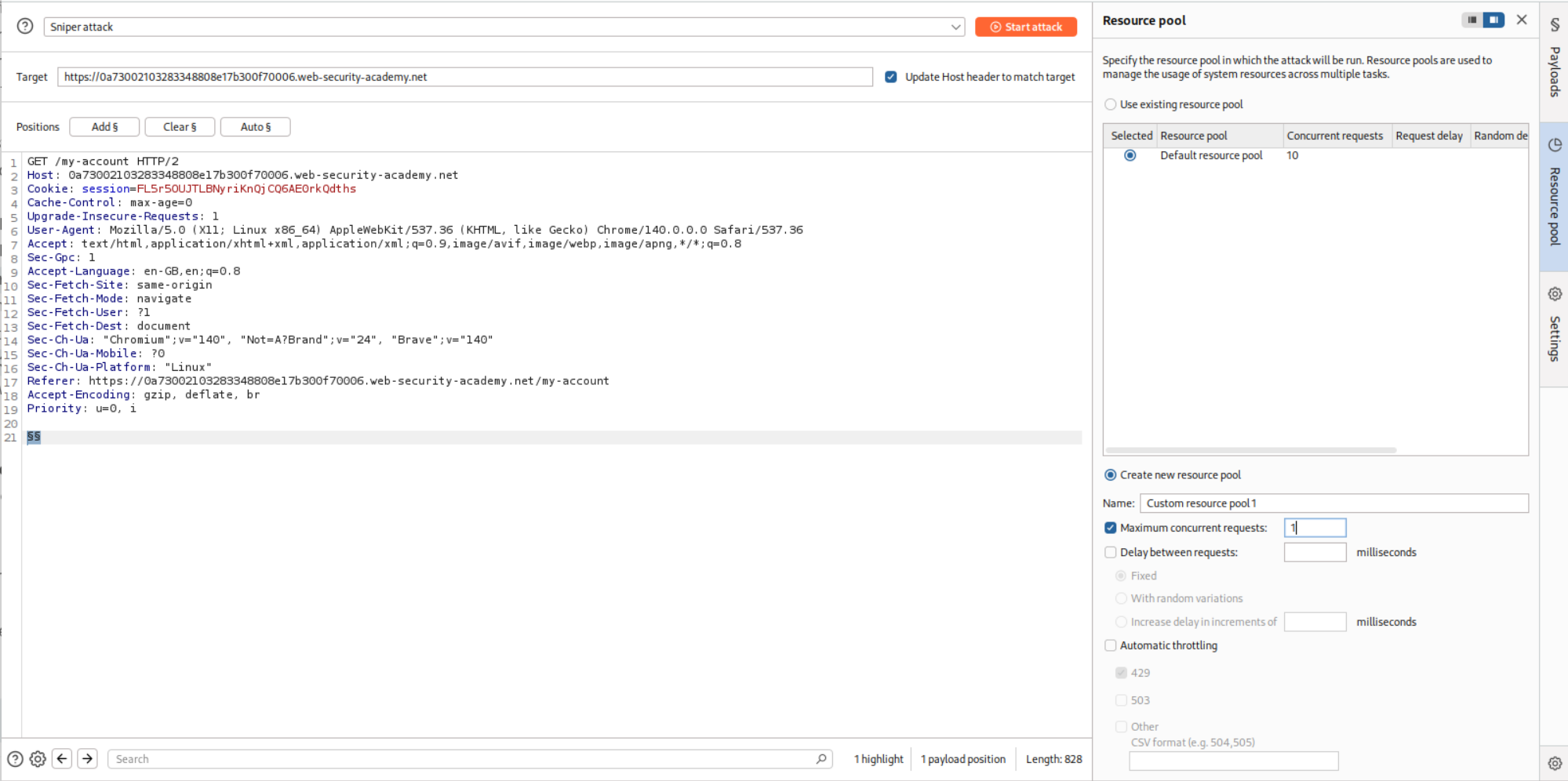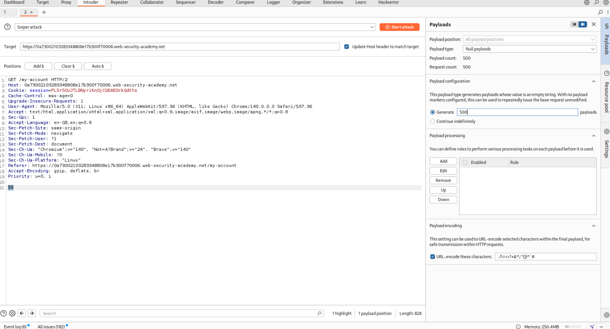 Now we send the GET request that fetches our my-account page to Intruder and then we will add a payload and set it to null payloads, which will run 500 requests.