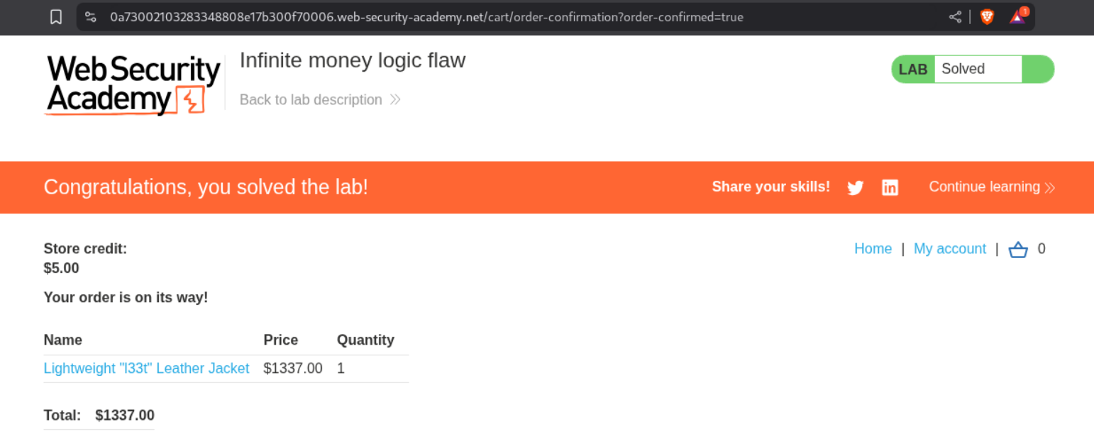 At around 405 requests, we see that we are beyond 1337$ in store credit which is beyond what we need for buying the Lightweight l33t leather jacket.