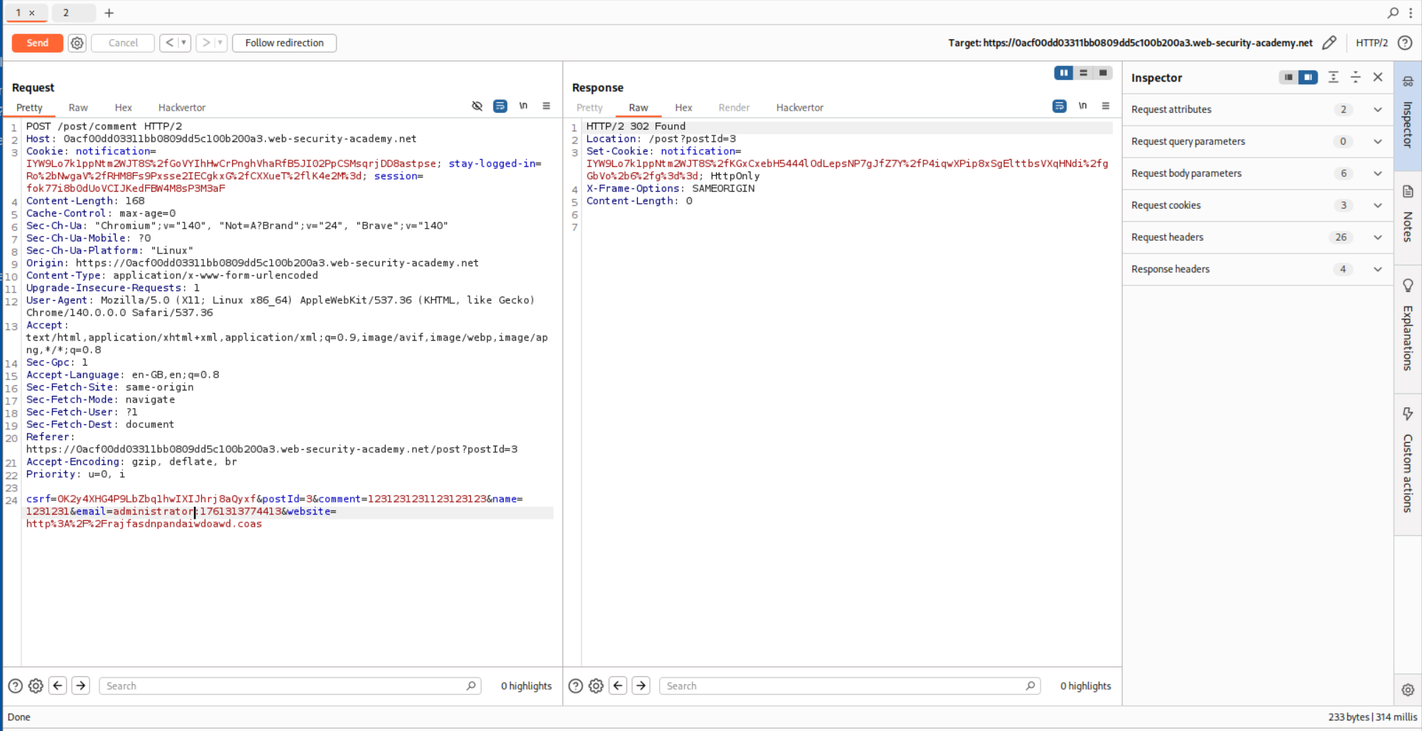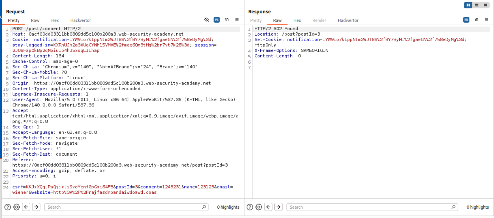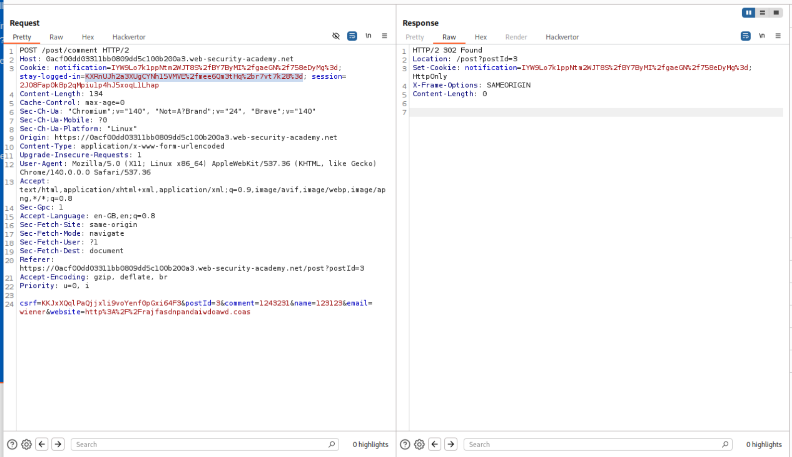 We will se that this POST request to comment endpoint that is returning a set-cookie header.
