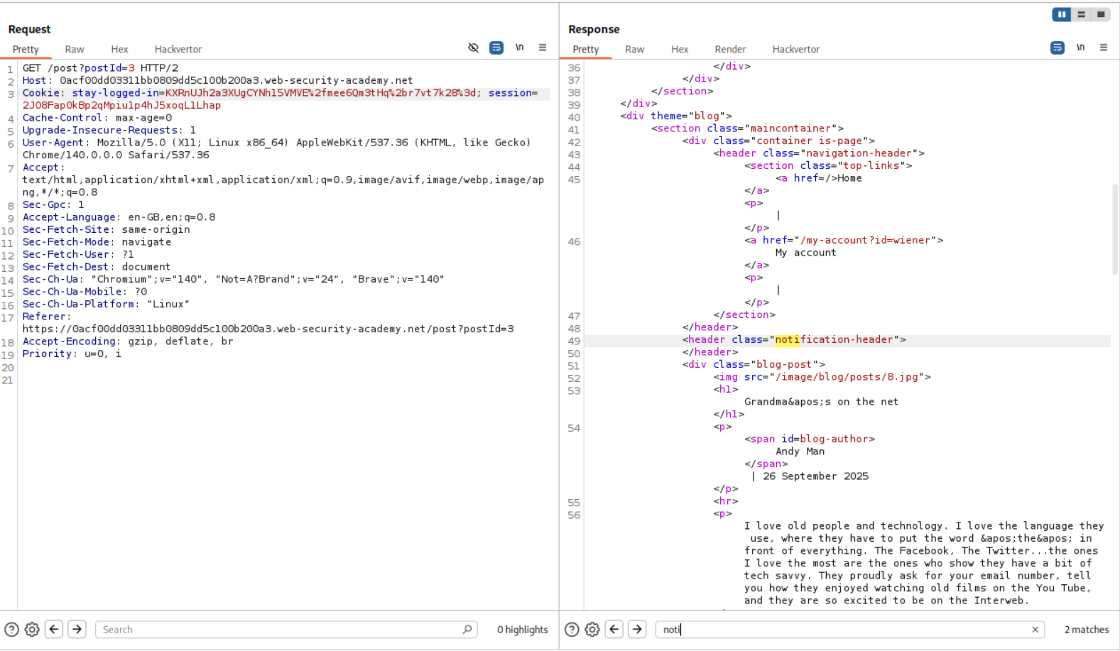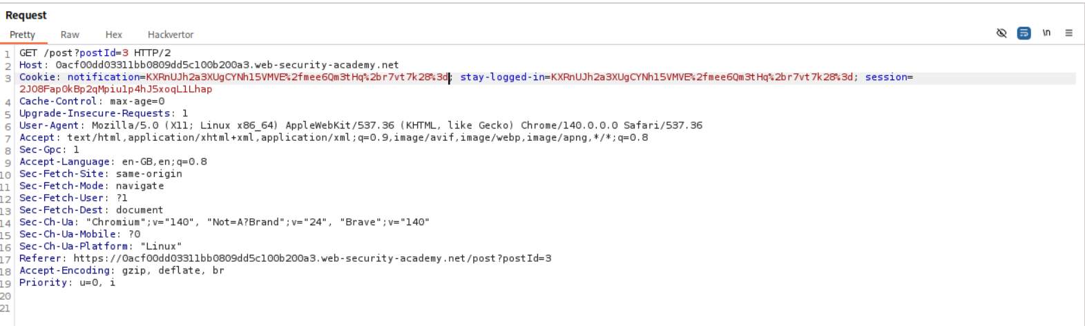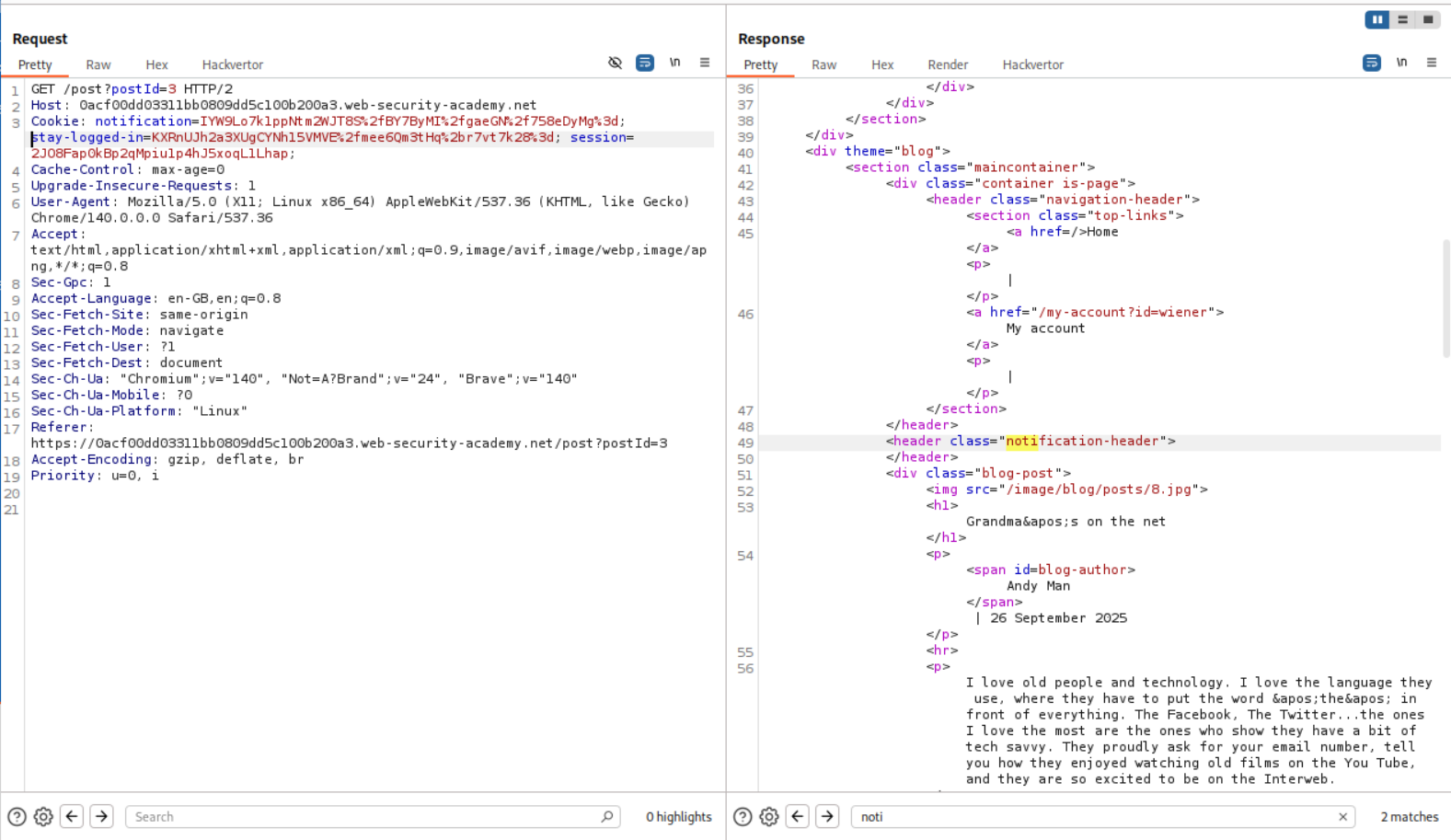 Then I intercepted the GET request and again pasted in the stay-logged-in cookie’s value in place of notification cookie’s value.