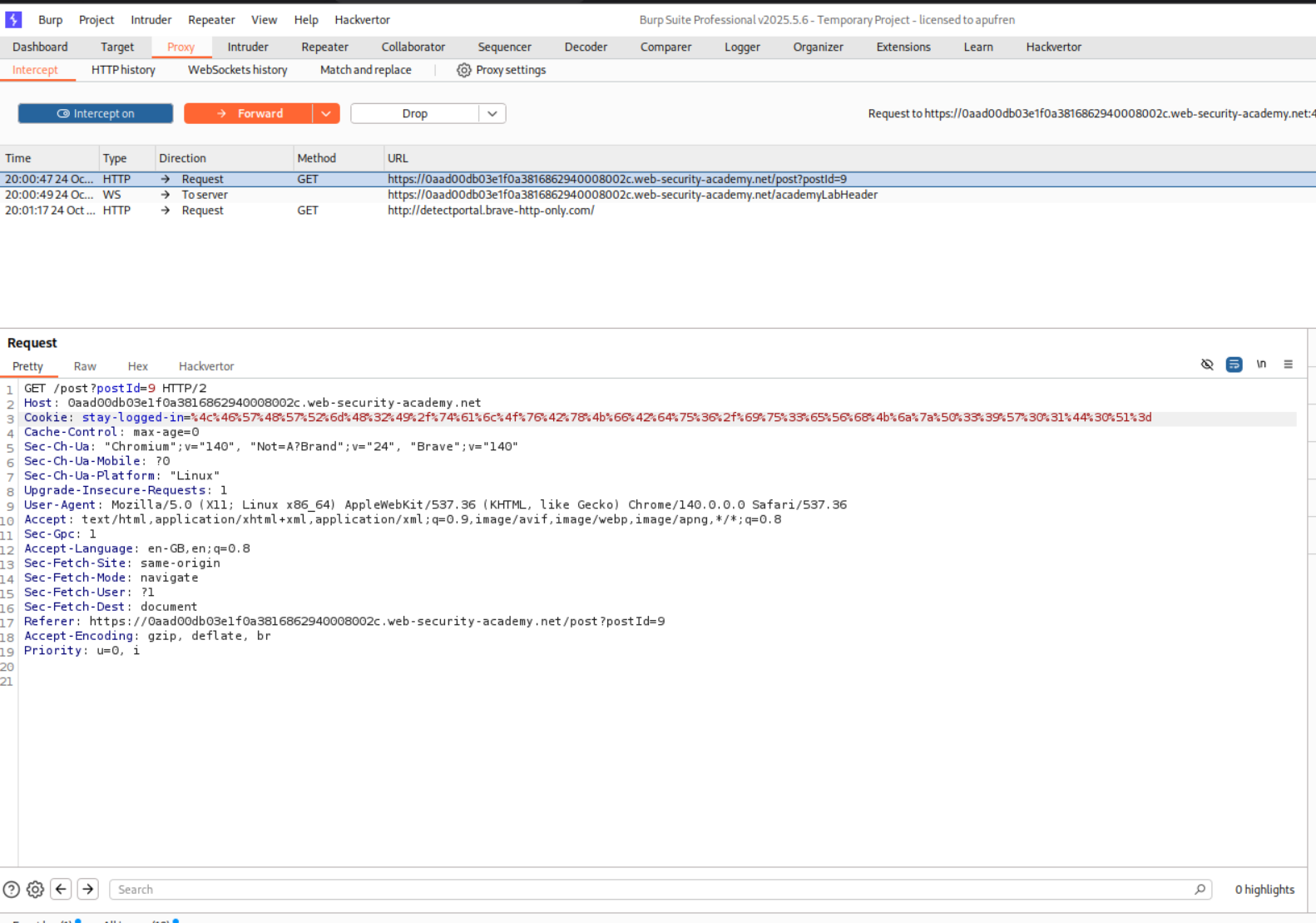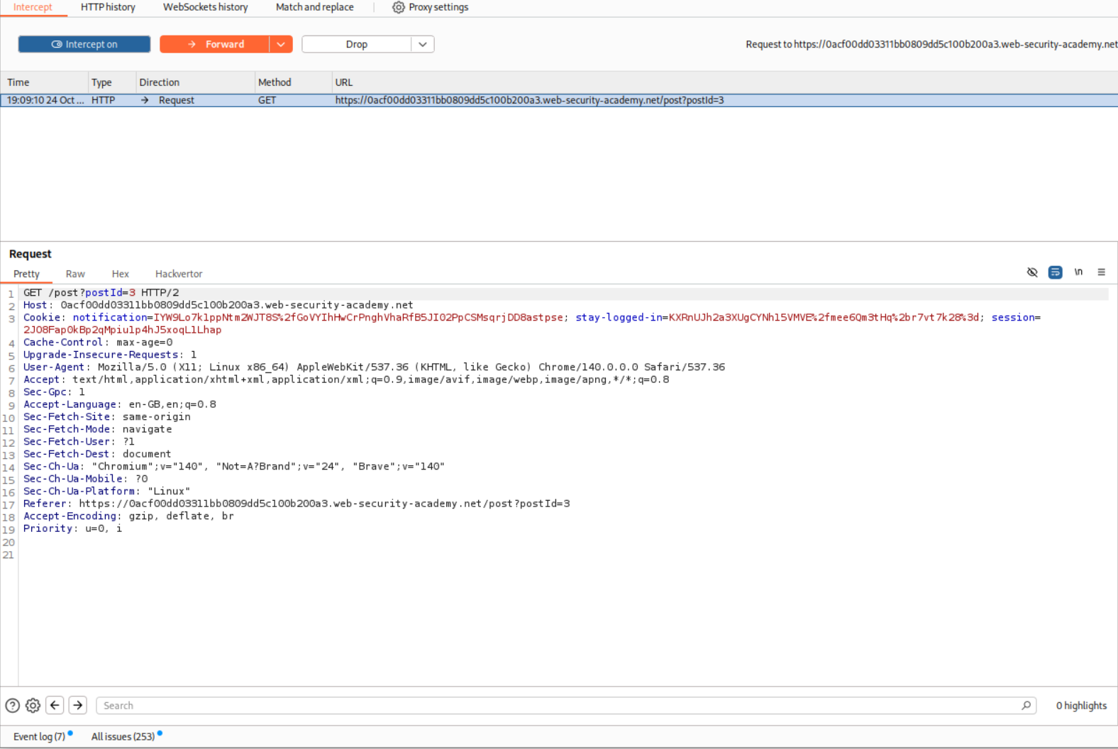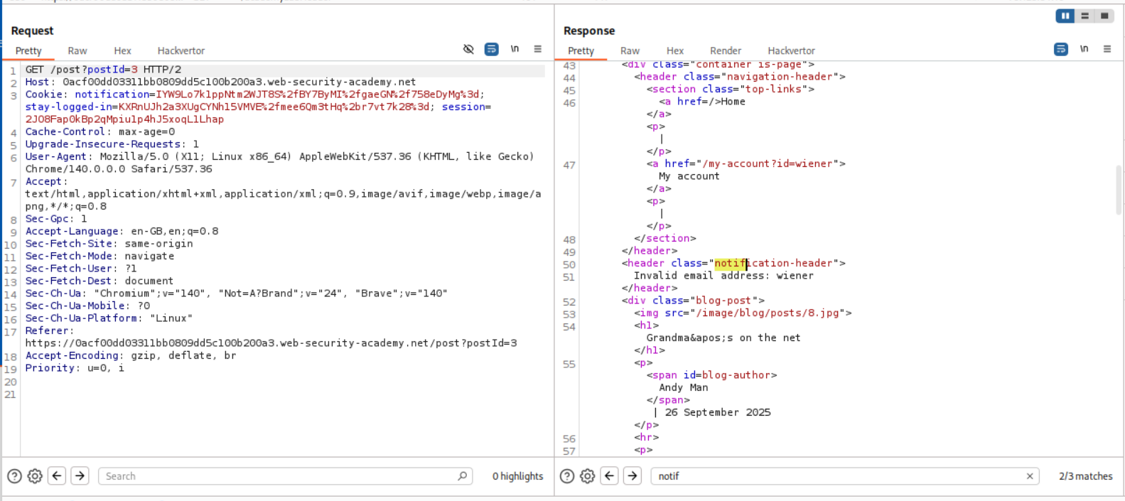 Then I intercepted the GET request and again pasted in the stay-logged-in cookie’s value in place of notification cookie’s value.