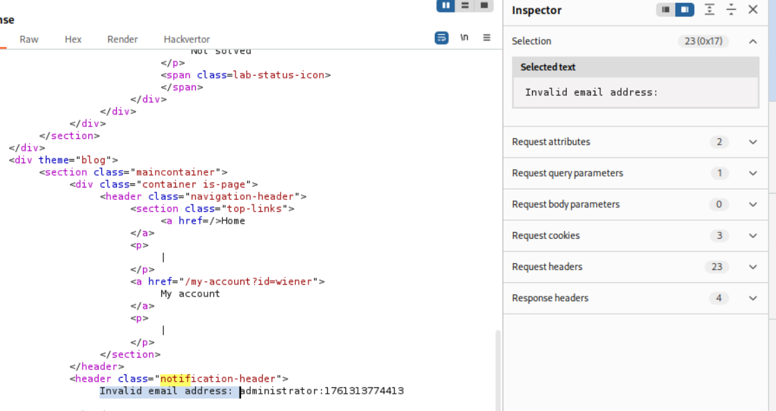 Now we get the response in the notification-header tag as Invalid email address: administrator:timestamp.