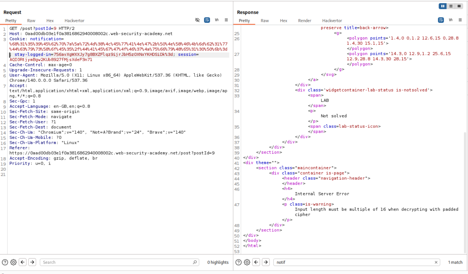 Sending this updated cookie gave us a 500 internal server error and it says that the input must be a multiple of 32.