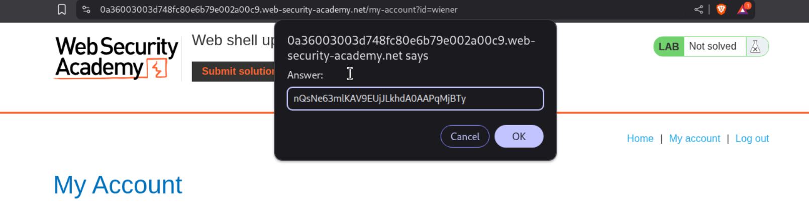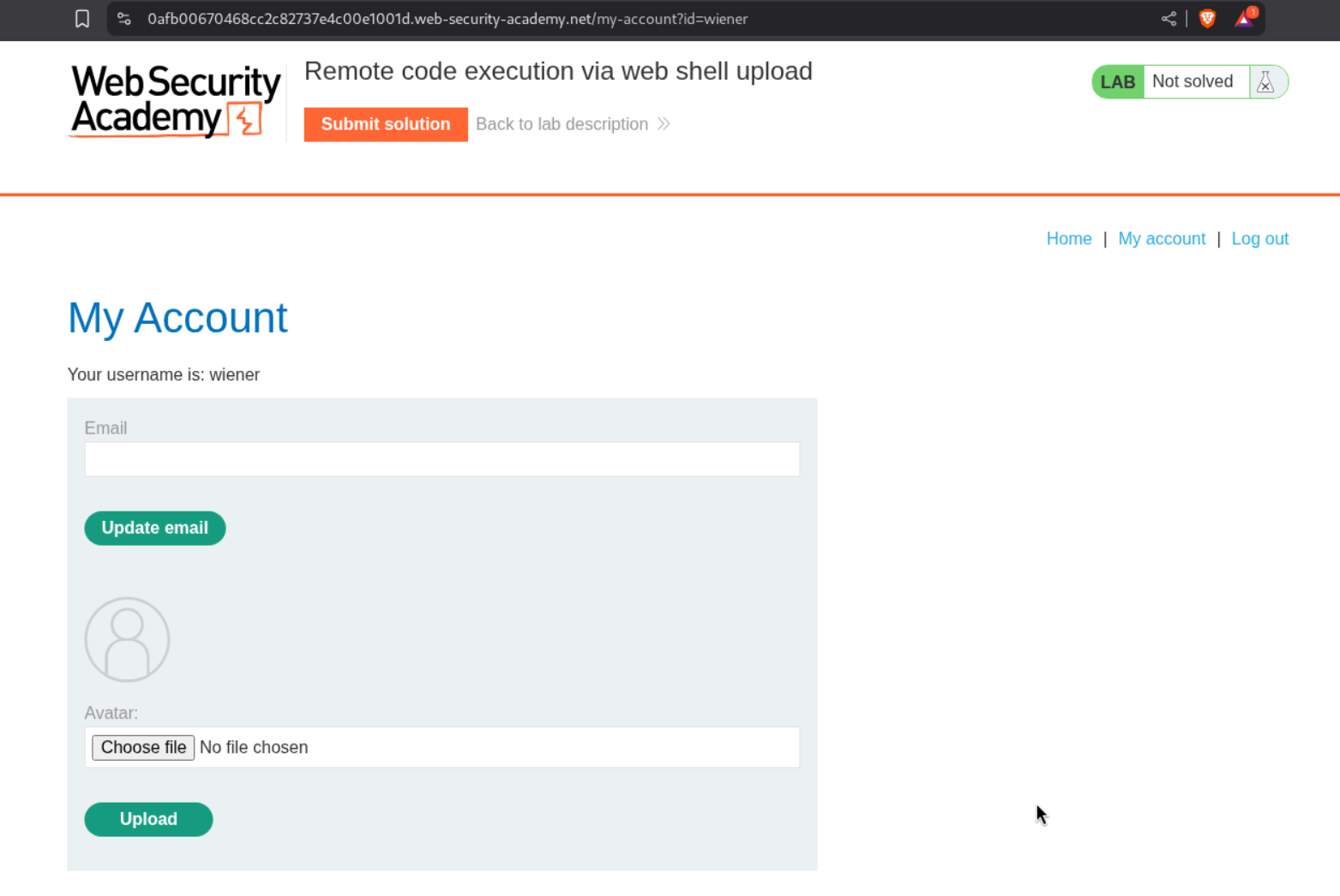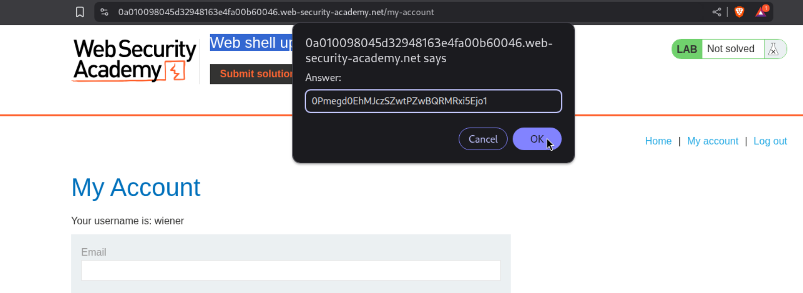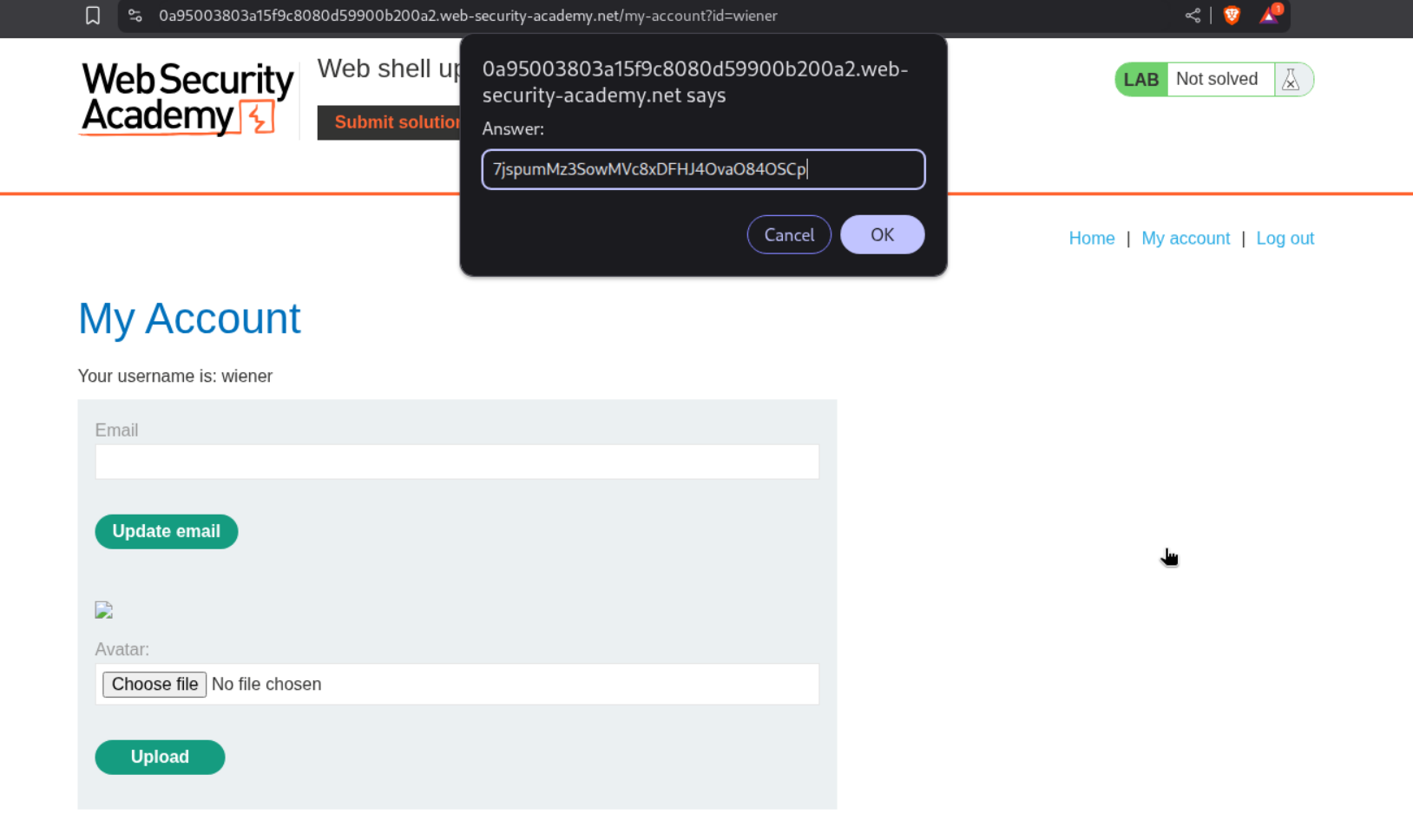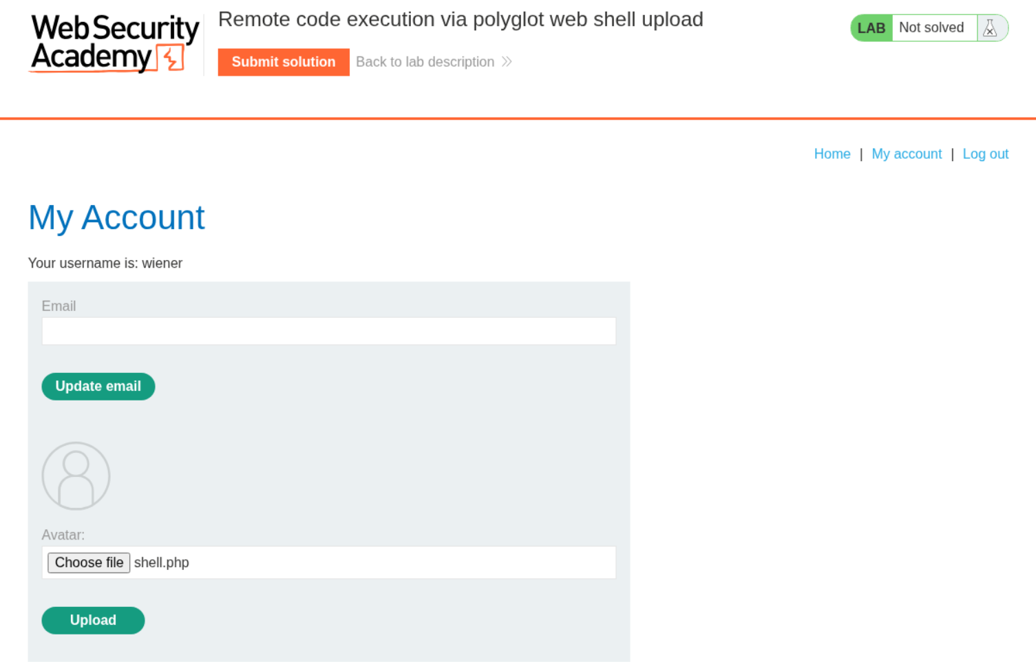 We need to upload a php webshell to the site via image upload function and submit the contents of the file at /home/carlos/secret to solve the lab.