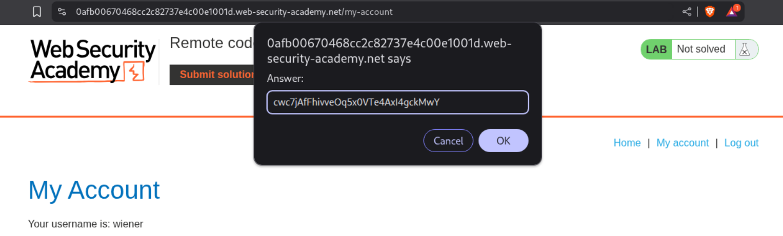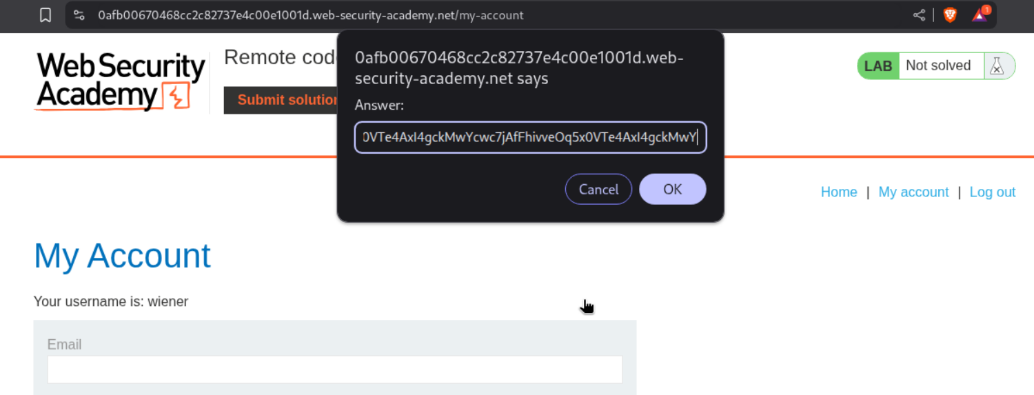 When I tried to submit it, it failed. Looking back at the output for id as well as the cat+/home/carlos/secret we can see that the output that we get from the RCE is repeated twice