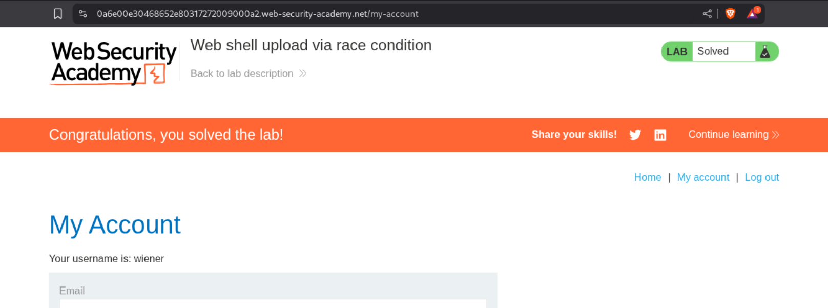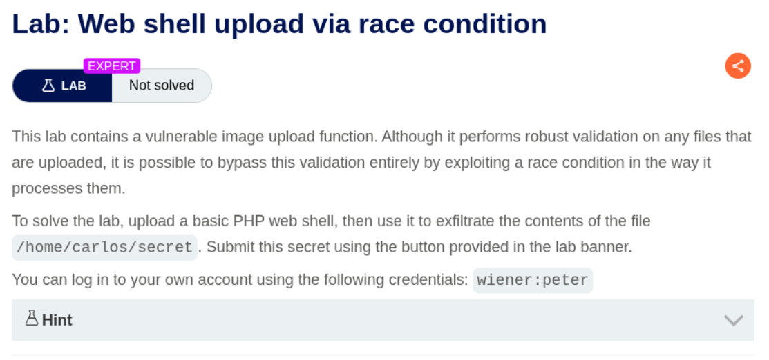 The race condition lab was especially interesting. Understanding that files exist temporarily before validation—and that this window can be exploited by sending simultaneous upload and access requests—showed how timing vulnerabilities work in practice. Running two Burp Intruder attacks concurrently to win the race was a practical demonstration of a concept I’d only read about before.