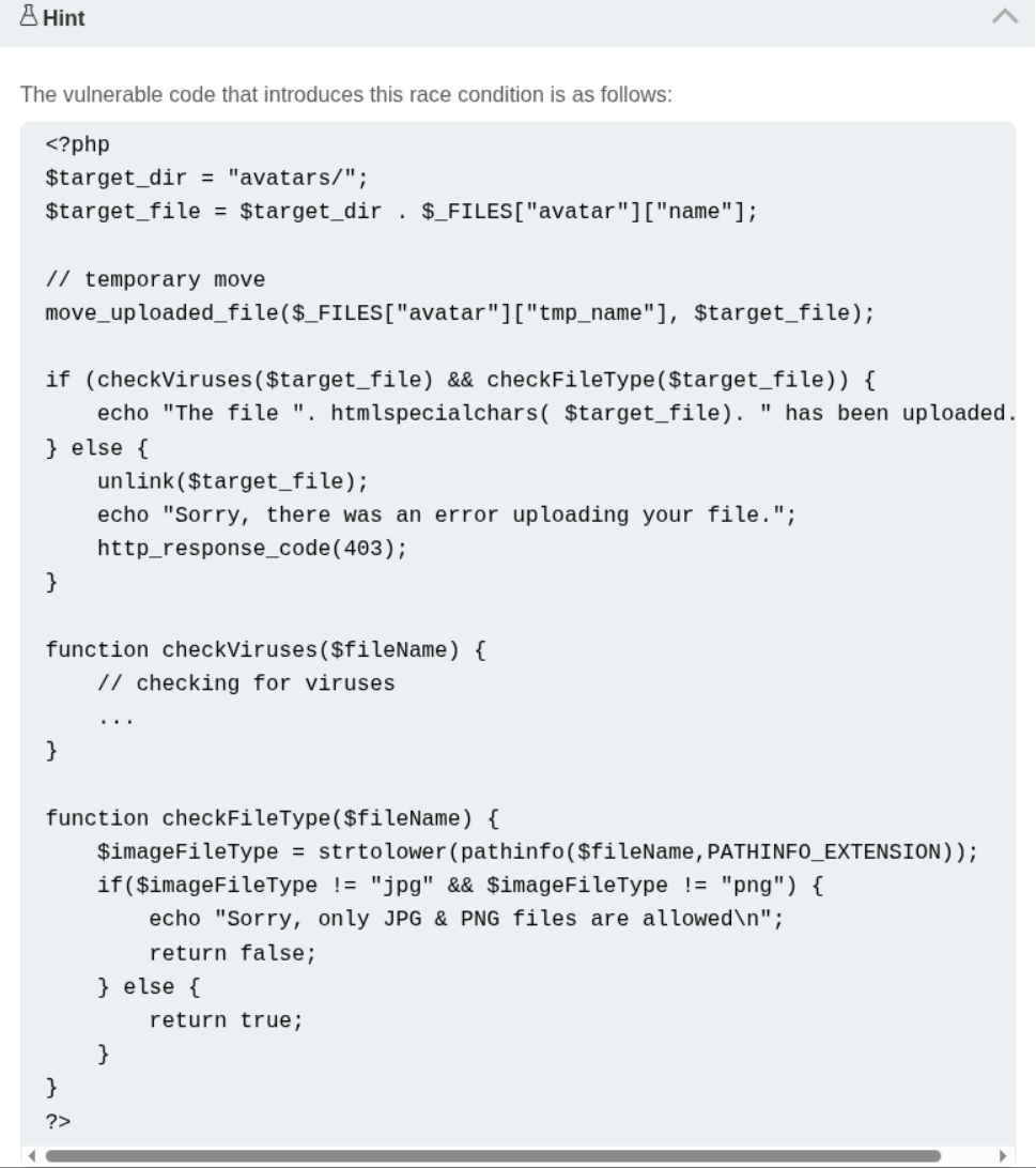 We are given the vulnerable code which has the race condition. Honestly from what I understood, we must send the request to the server as fast as possible so we can get a response before the file gets deleted. The code doesn’t make much sense to me as per how the race condition was introduced and how can it be avoided. I will read about this later or ask AI.