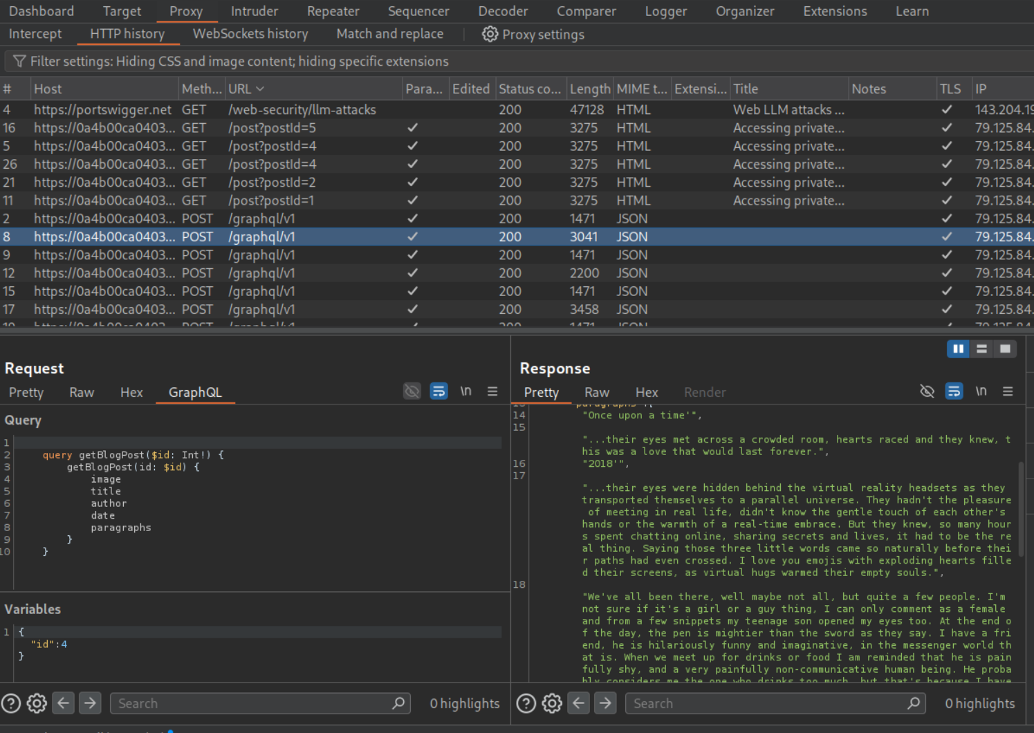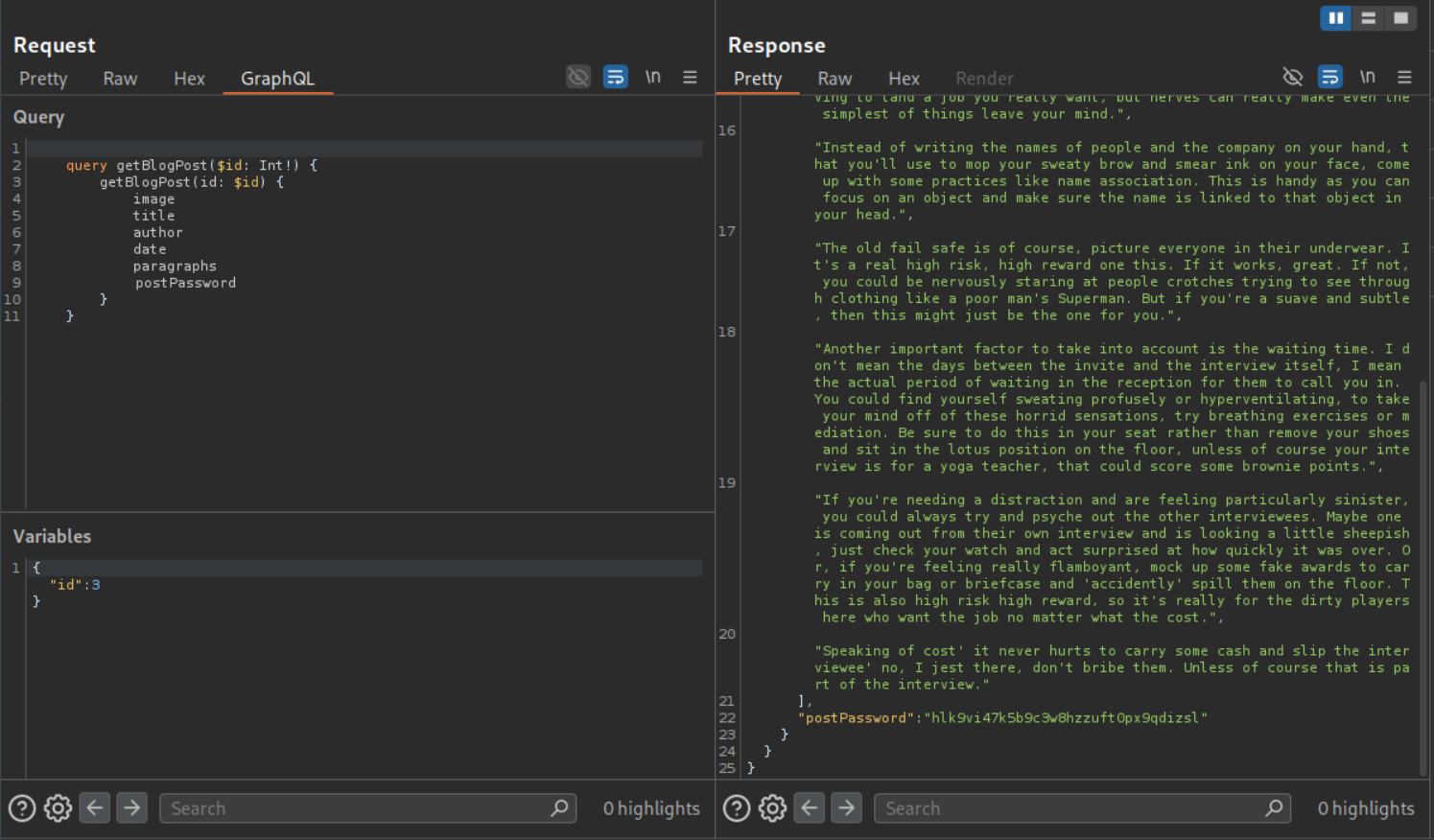 We send the request by changing id to 3 and add a postPassword to the query under paragraphs. The query consists of variables that will be returned to us, this now includes postPassword. We can see the value of postPassword.
