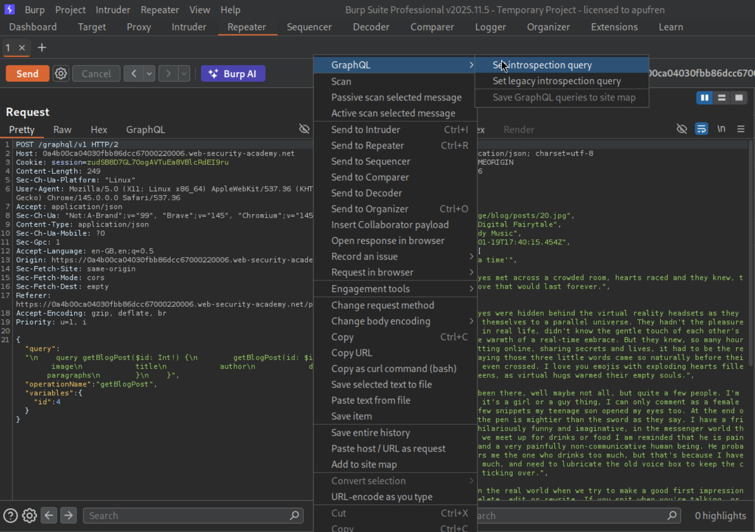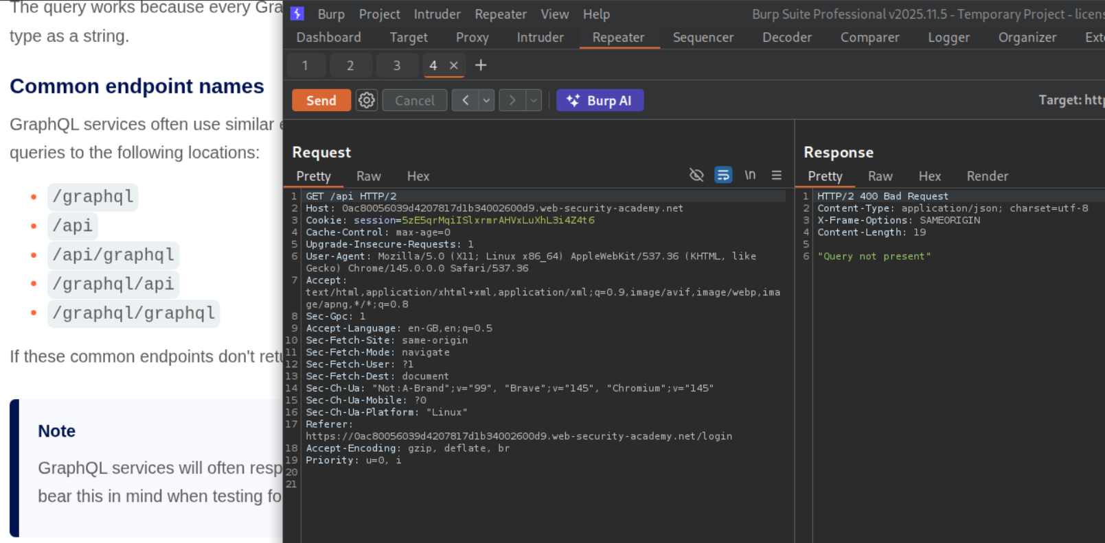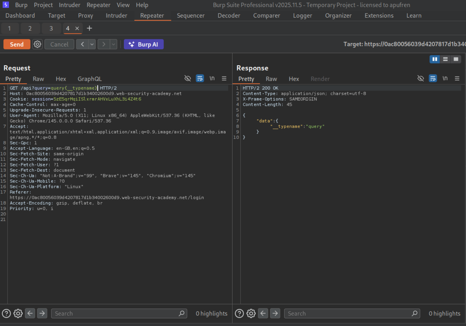 We can see that GraphQL is being used for authentication. We send this request to repeater.