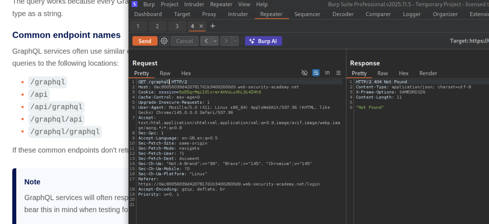 We will send a GET request to repeater and test the common paths for the GraphQL endpoint. We can see /graphql gives us a response of Not Found.