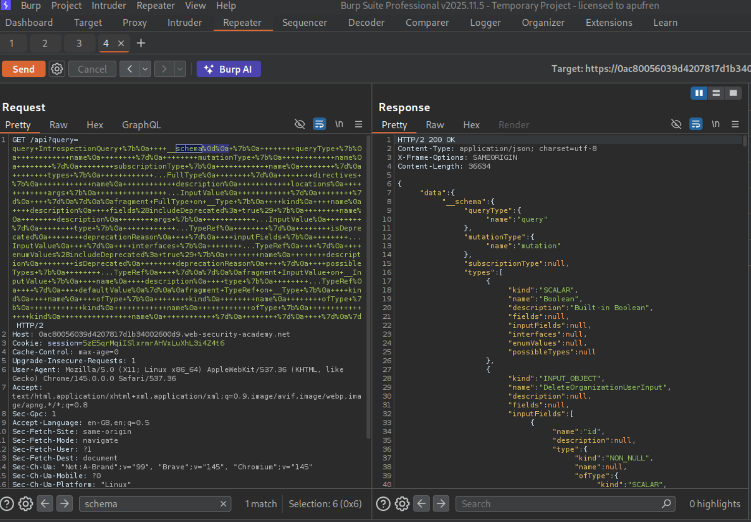 We will send the introspection query by sending the rest of the query with a new line or CRLF (carrier return line feed), that is URL encoded. This will give us GraphQL queries, mutations and the entire schema.