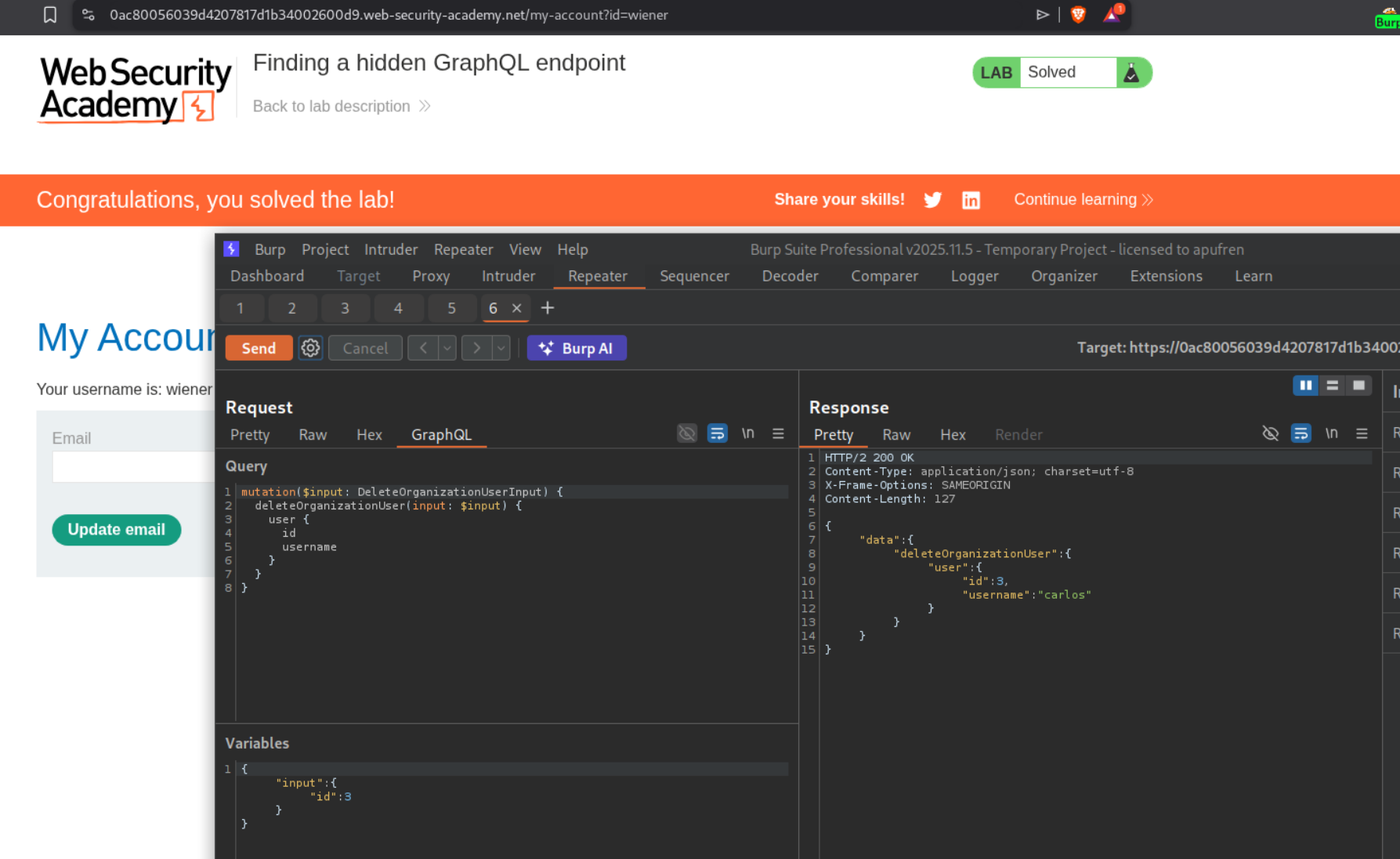 <input type="hidden" name="variables" value="{"input":{"email":"wiener@normal-user.com"}}" />