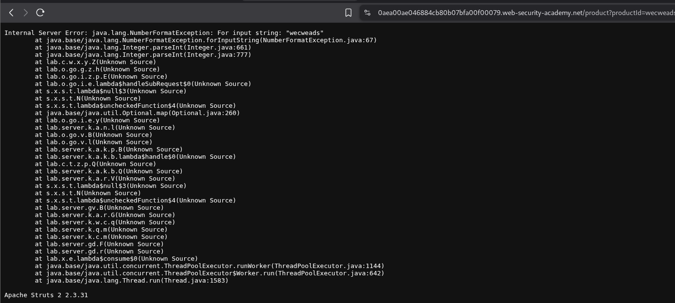 We need to trigger an error on this web applciation to find the version of a the vulnerable third-party framework.