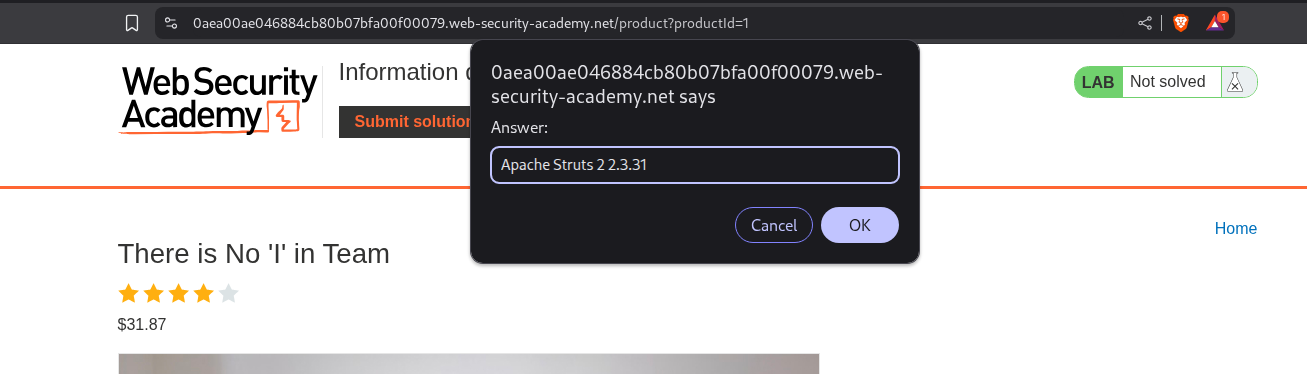 We put in the vulnerable version number as the answer - Apache Struts 2 2.3.31.