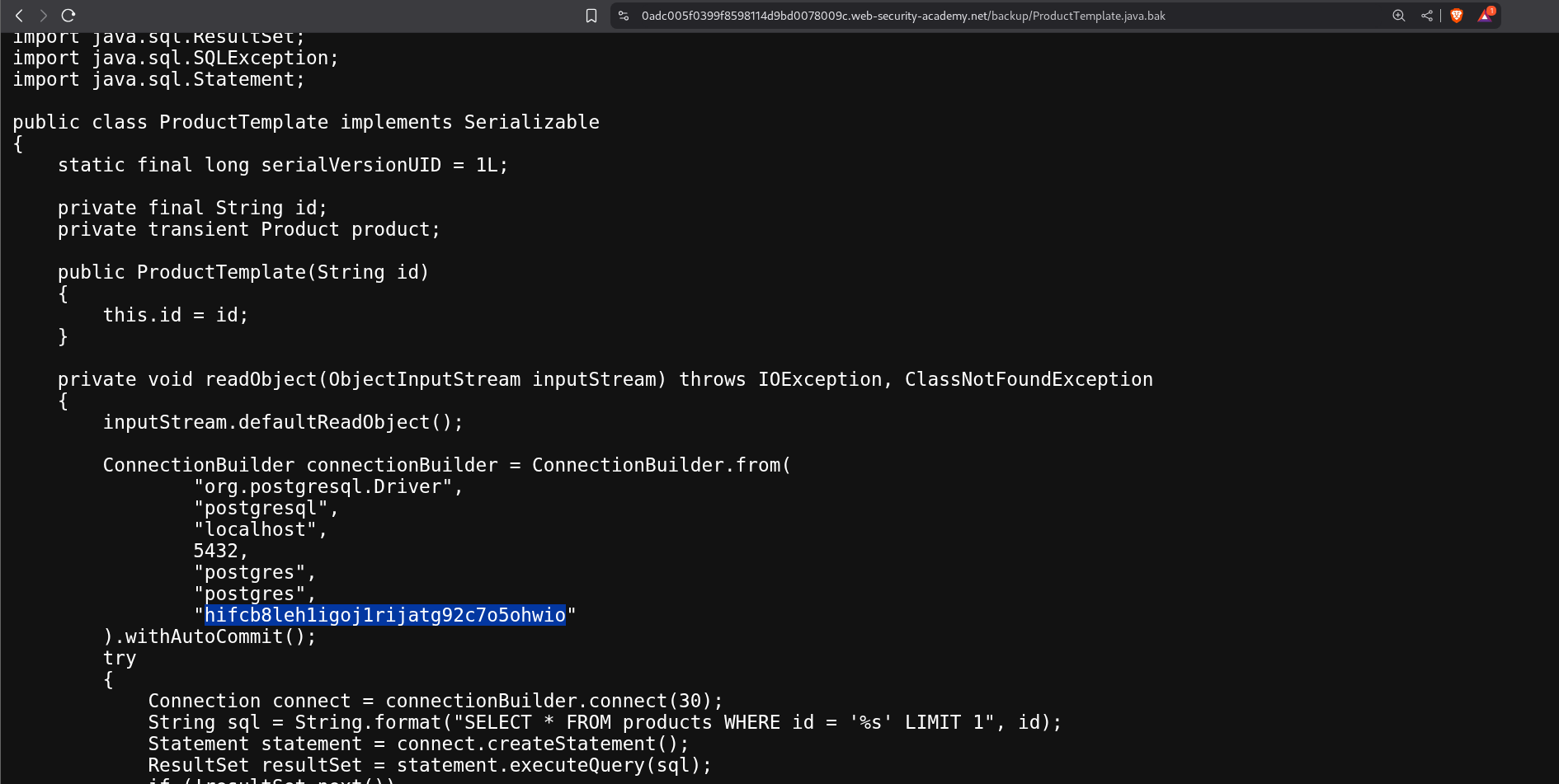 Clicking on it opens the source code in the browser and we can see a very long string that I am assuming is the password as its in the Constructor with other stuff related to the DB which we can see is postgres.