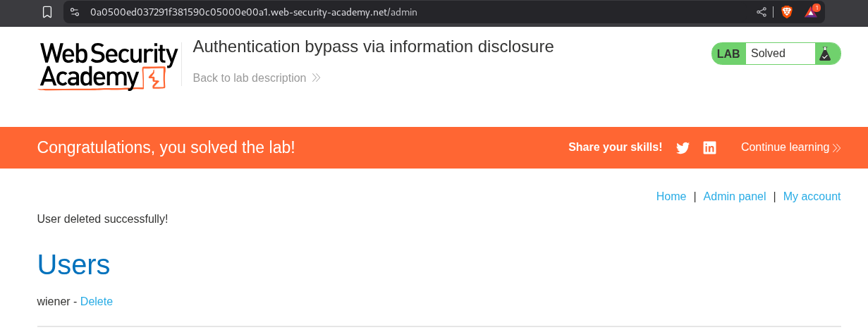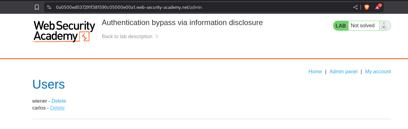 We can finally access the admin panel. We keep the intercept on and click on delete for user carlos.