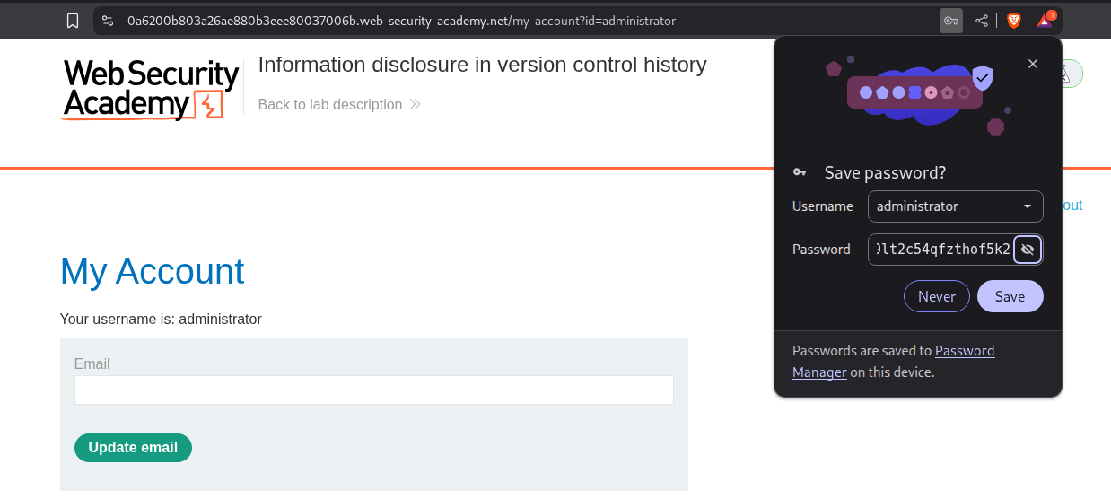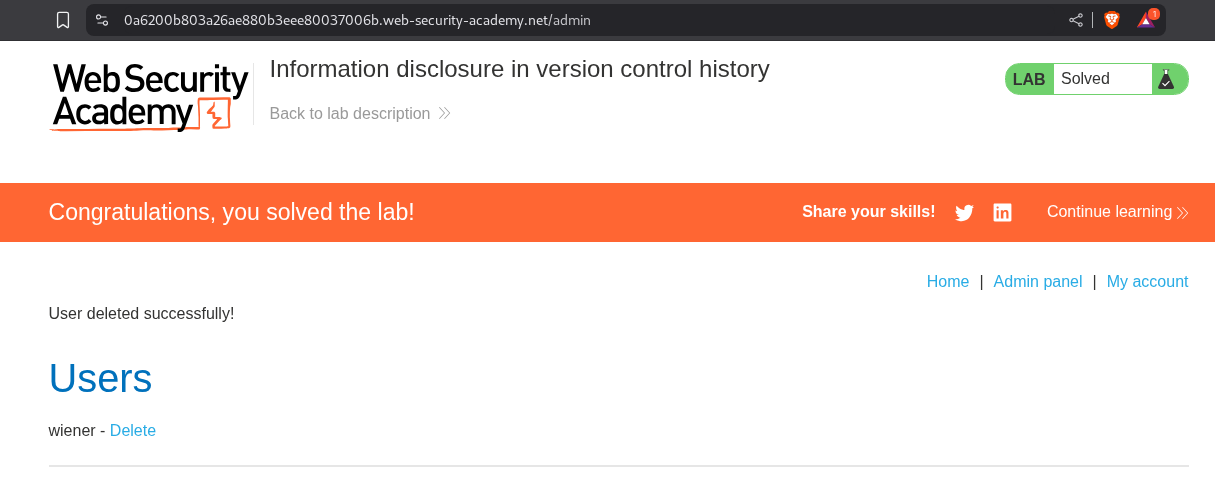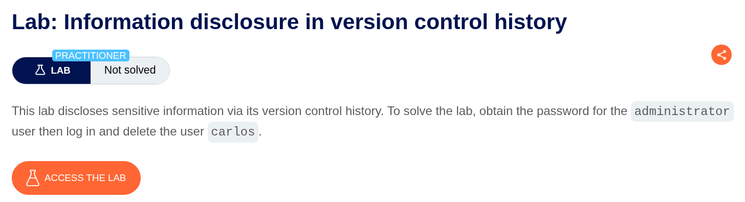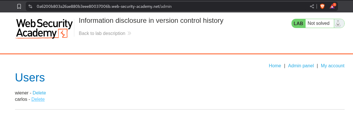 We need to find the admin password via exposed version control history. Then login and delete the user carlos.