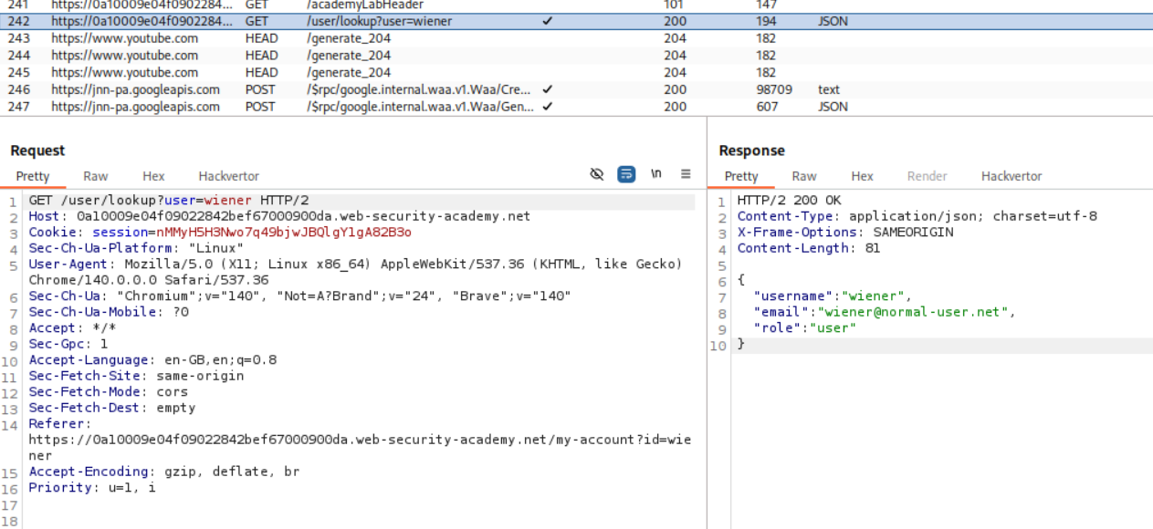 Okay so the POST request to login was request number 238 and there is a GET request that goes to /user/lookup?user=wiener which is request number 242. We need to send this request to repeater.