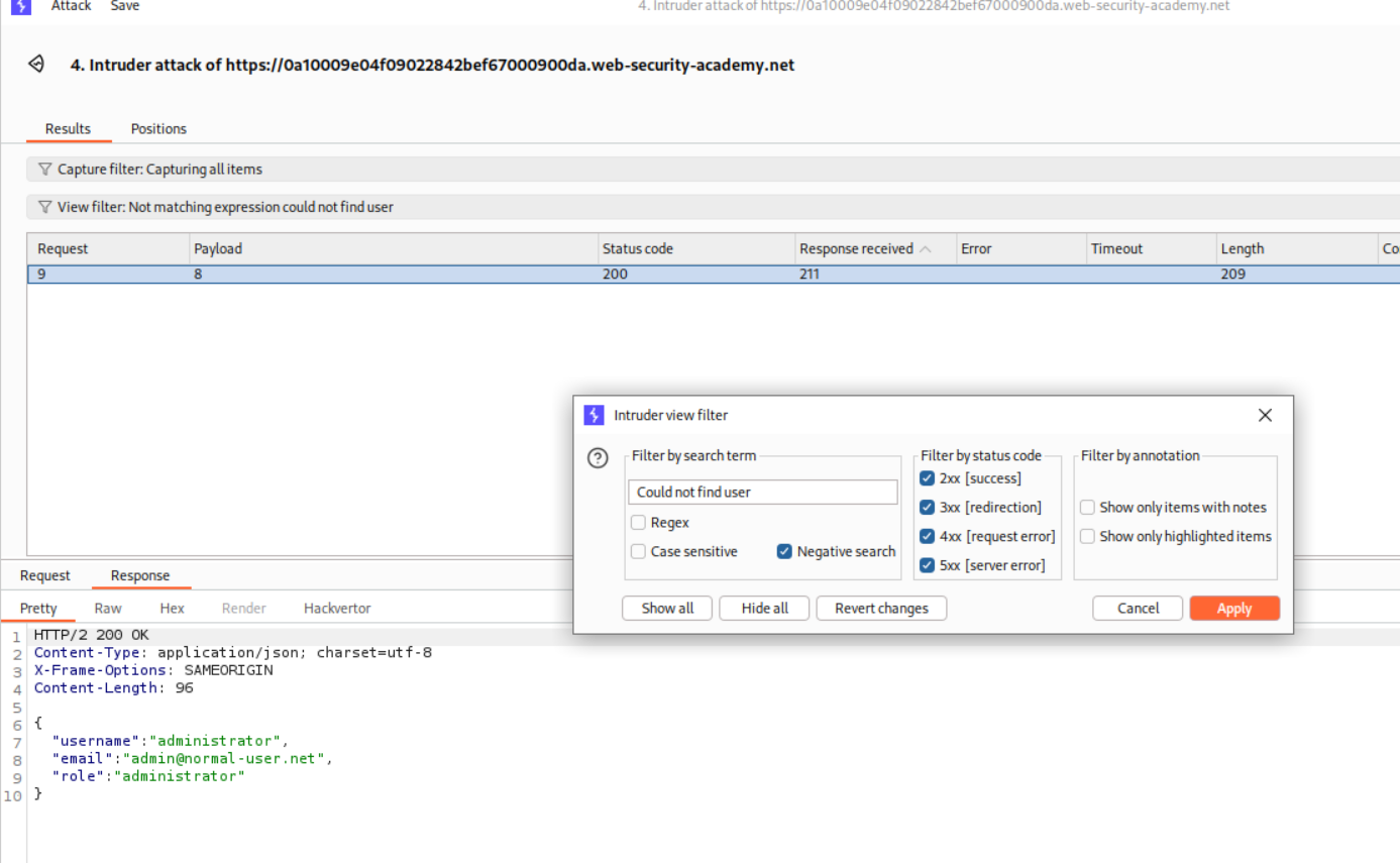 By filtering the responses using the Could not find user negative search, we filter out the invalid requests and see that the password length is 8.