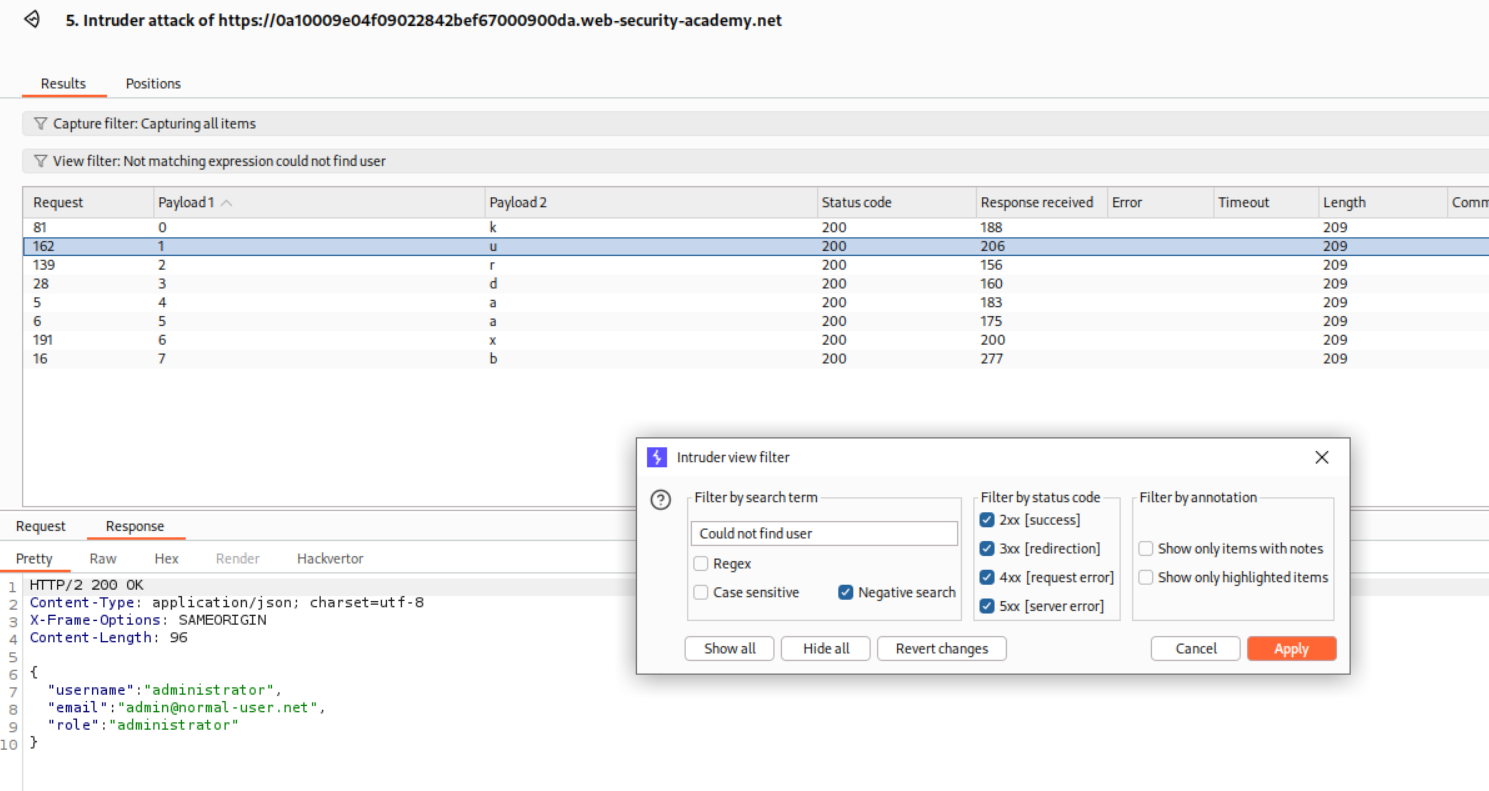We will run this via Intruder, add the negative search for Could not find user and sort by Payload 1. Therefore we get the password as kurdaaxb.